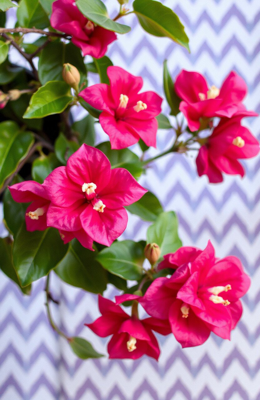Bright pinks and purples create a vibrant, floral feel. The batik chevron pattern adds a playful touch.