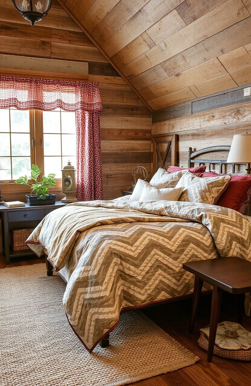 Earthy browns and reds create a warm, cozy feel. The batik chevron pattern adds depth and texture.