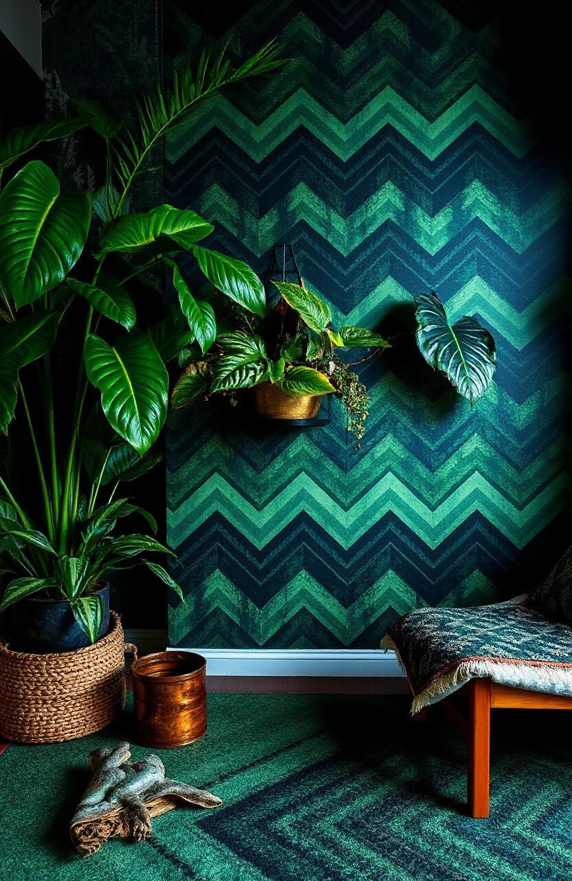 Deep greens and blacks create a mysterious jungle vibe. The batik chevron pattern adds depth and texture.