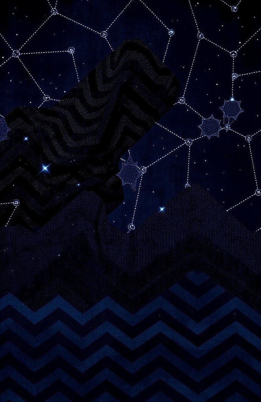 Dark blues and blacks create a mysterious, starry feel. The batik chevron pattern adds depth and intrigue.