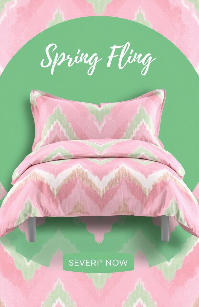Pastel pinks and greens create a fresh, spring-like feel. The batik chevron pattern adds a playful touch.