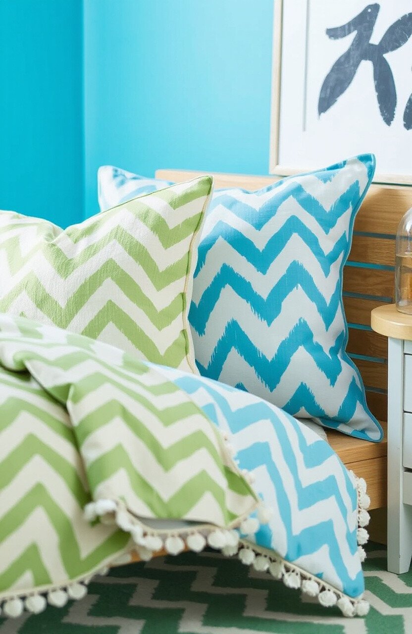 Bright blues and greens create a fun, summery feel. The batik chevron pattern adds a playful touch.