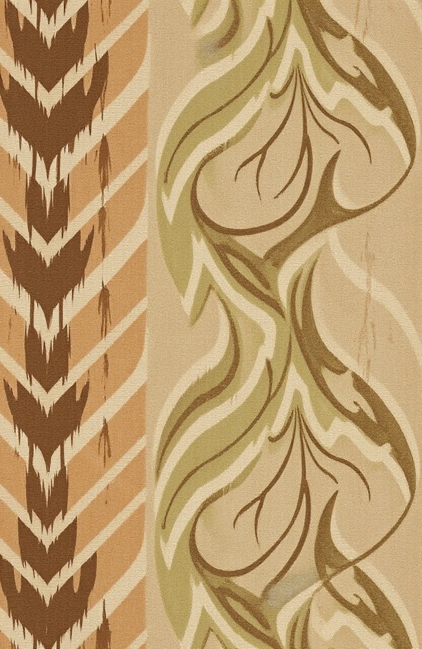 Muted browns and greens create a sophisticated, earthy feel. The batik chevron pattern adds depth and texture.