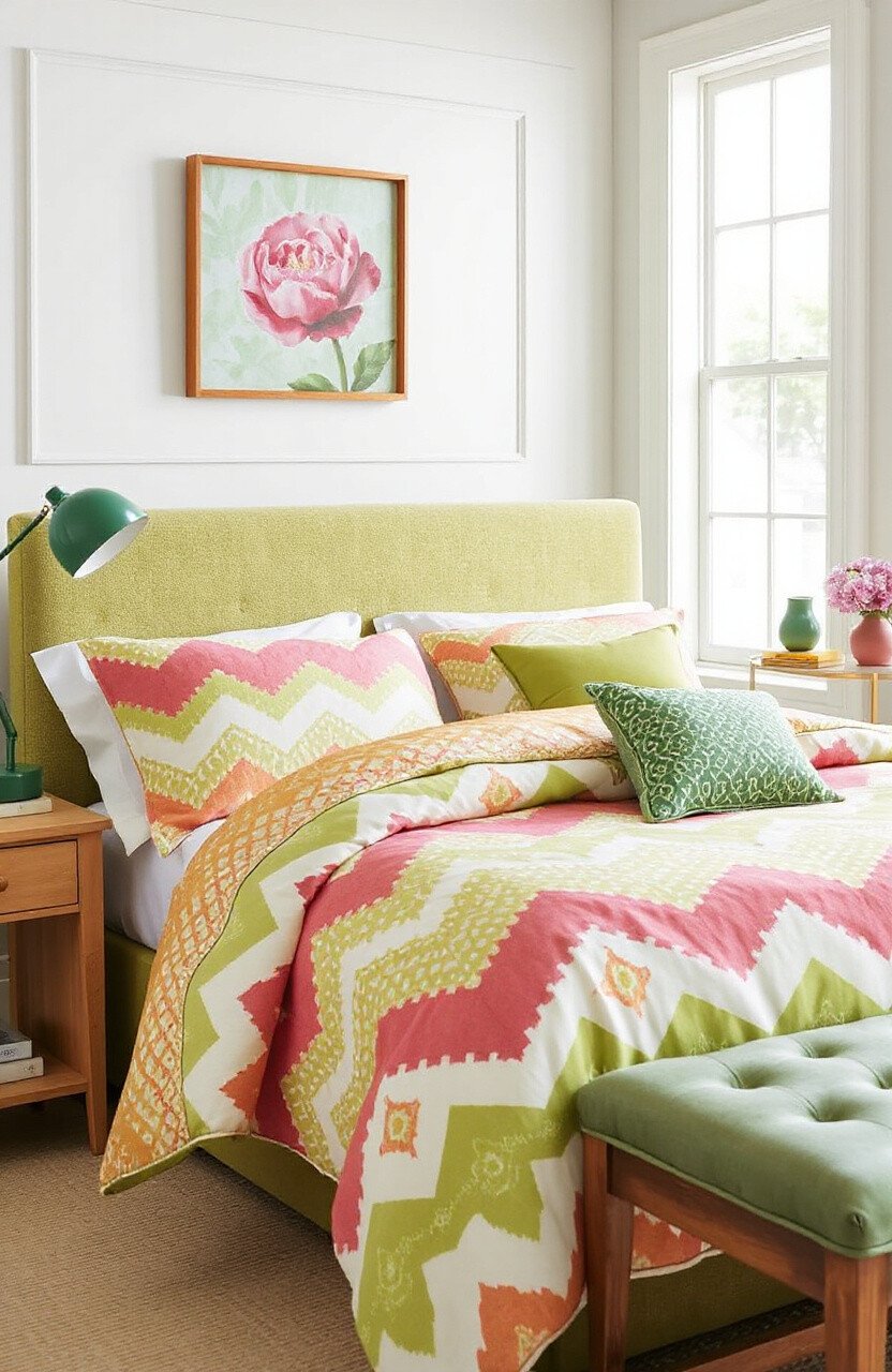 Bright greens and pinks create a vibrant, garden-like feel. The batik chevron pattern adds a playful touch.