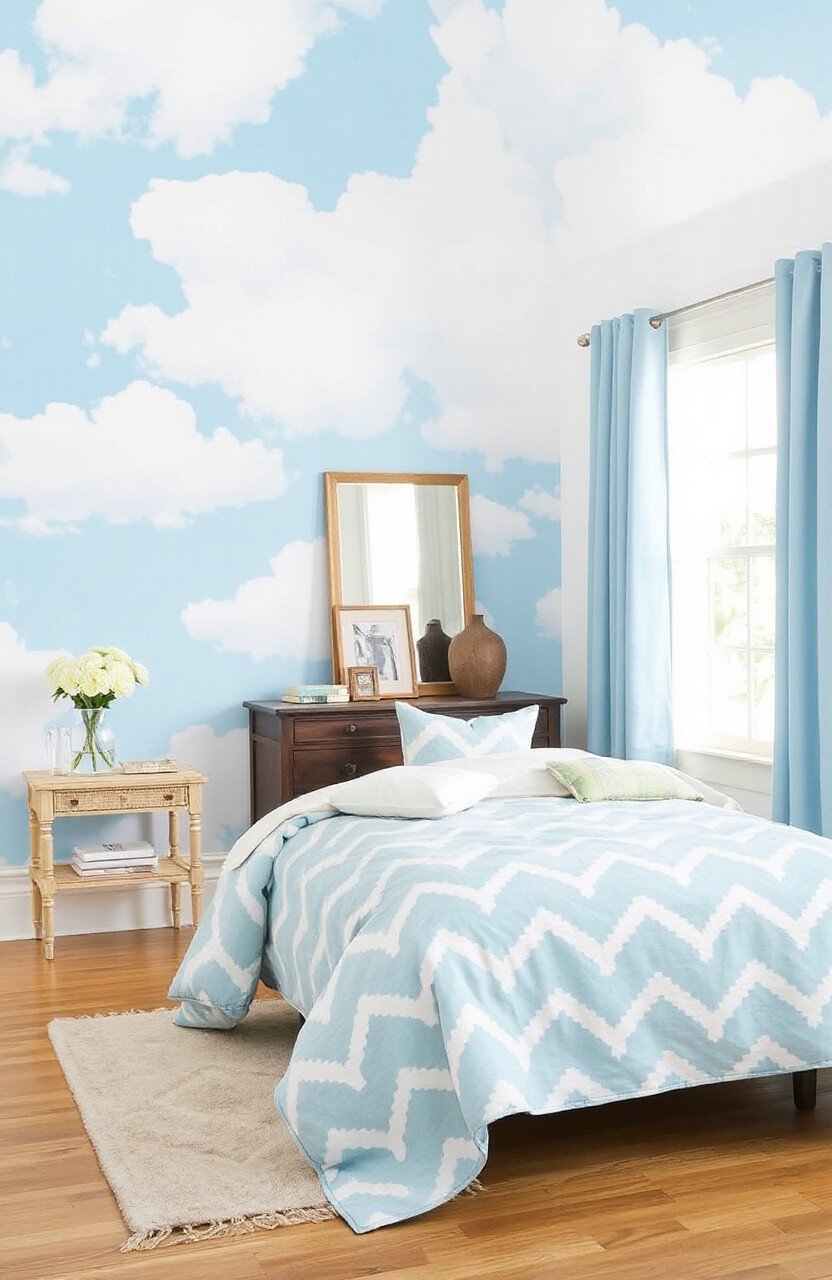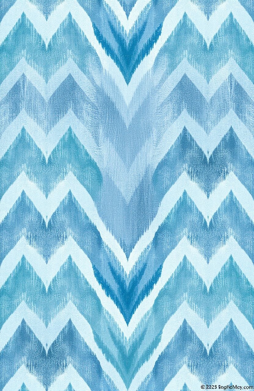 Light blues and whites create a calming, sky-like effect. The batik chevron pattern adds a whimsical touch.