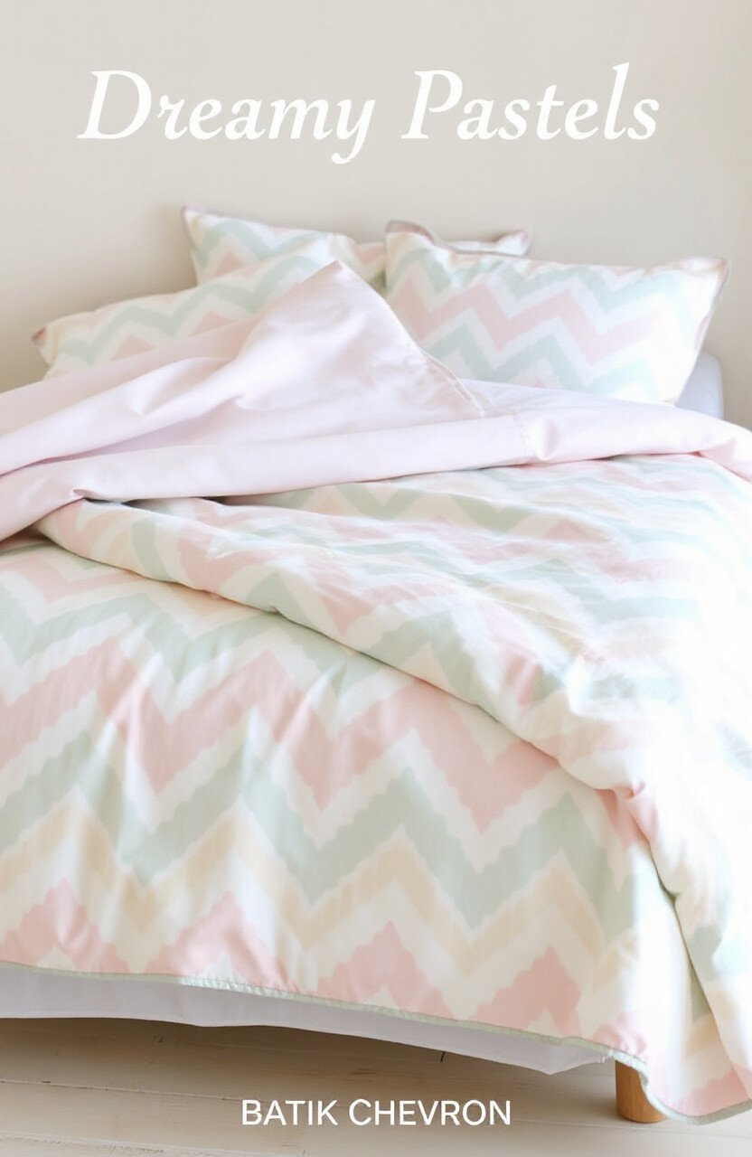 Soft pastels create a dreamy, gentle feel. The batik chevron pattern adds a whimsical touch.