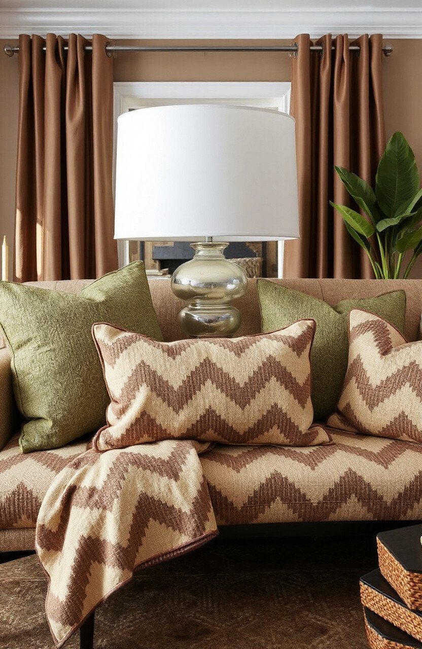 Earthy browns and greens create a cozy, rustic feel. The batik chevron pattern adds depth and texture.