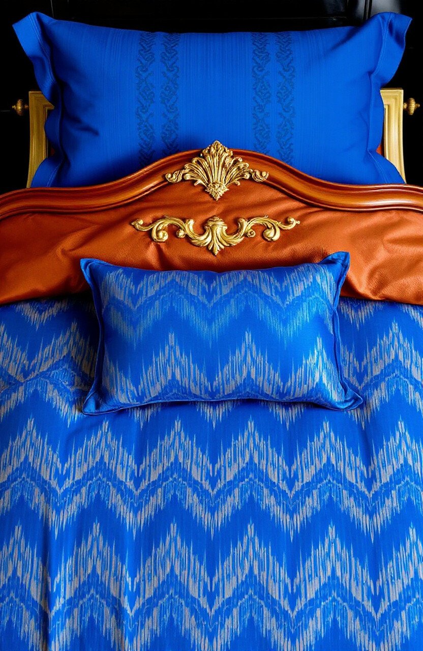 Rich blues create a regal, sophisticated feel. The batik chevron pattern adds an elegant touch.
