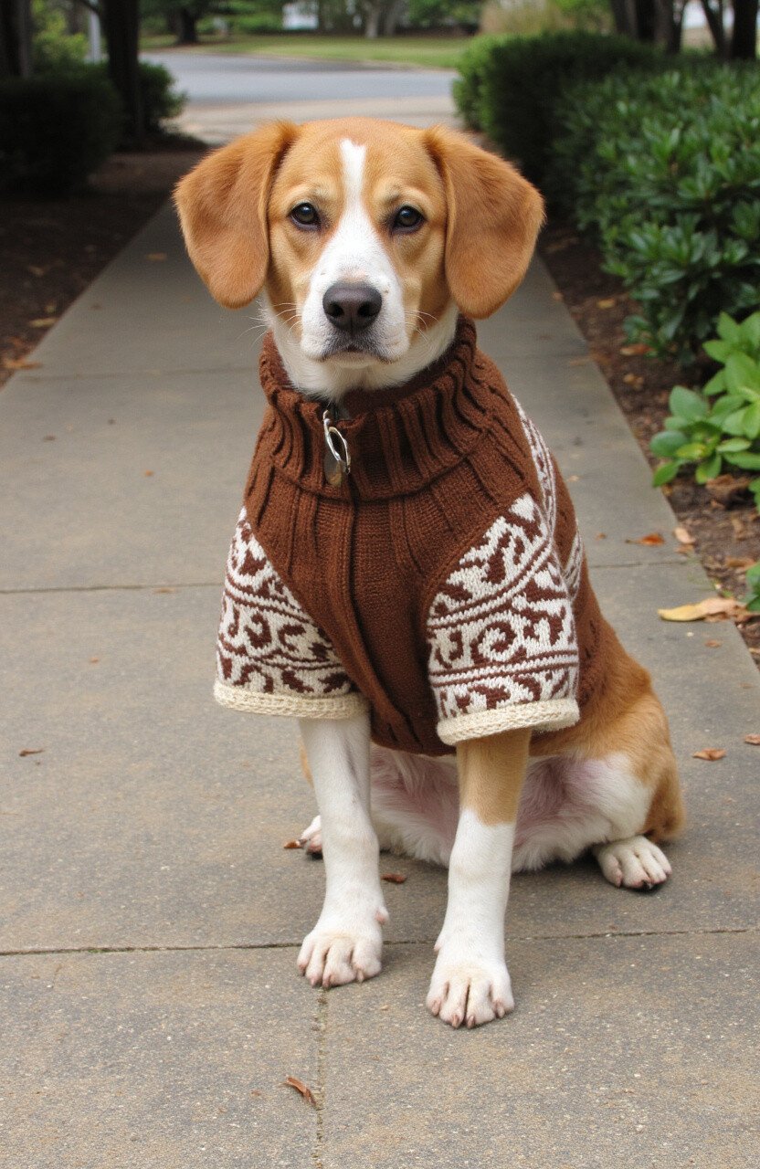 For the coffee lovers, this sweater features warm browns and creams. It’s like wrapping your dog in a warm cup of coffee.