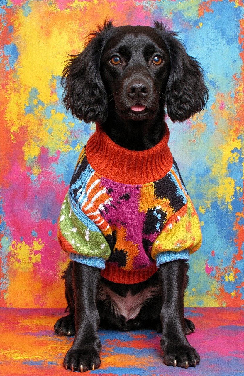 It’s great for dogs who love to stand out. Pair it with a simple collar to let the sweater be the star. It’s art, but on a dog!