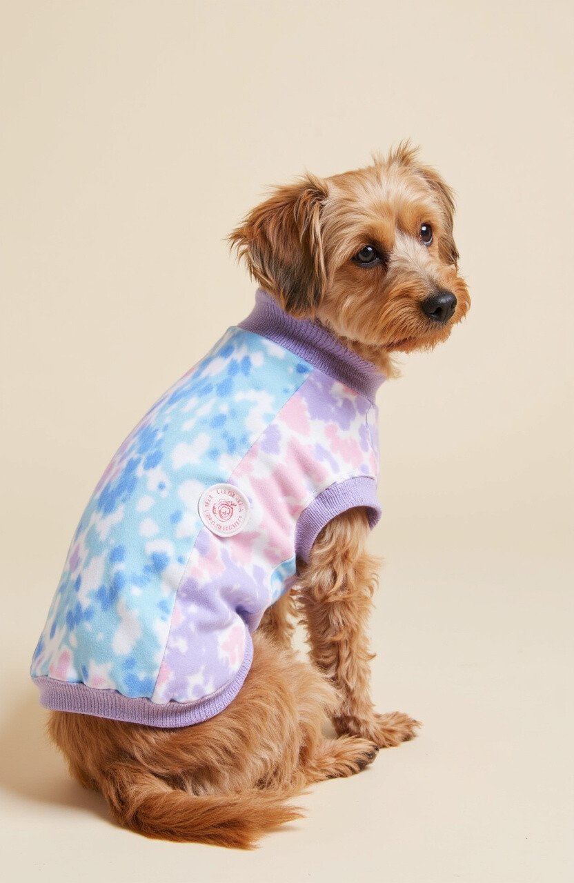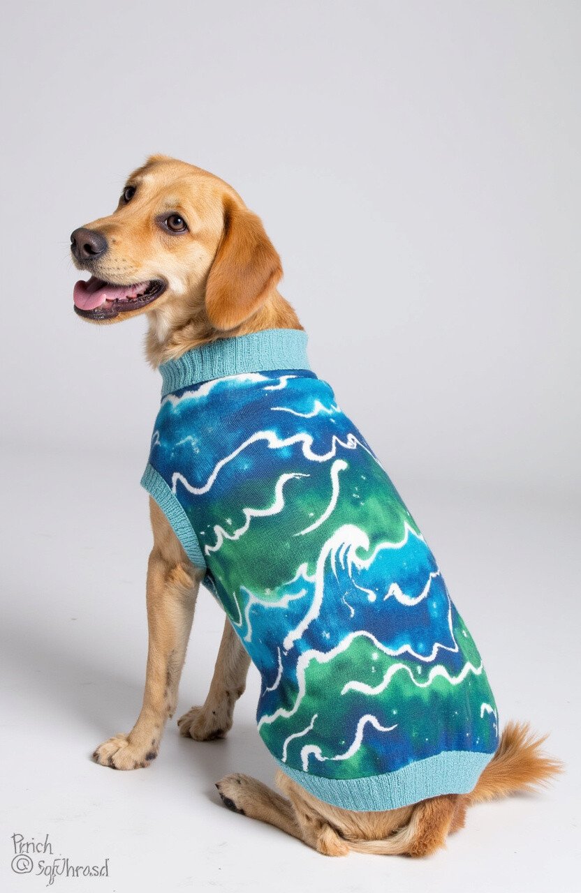 Bring the sea to your dog’s wardrobe with this ocean-inspired batik sweater. The blues and greens mimic the waves, creating a calming effect.