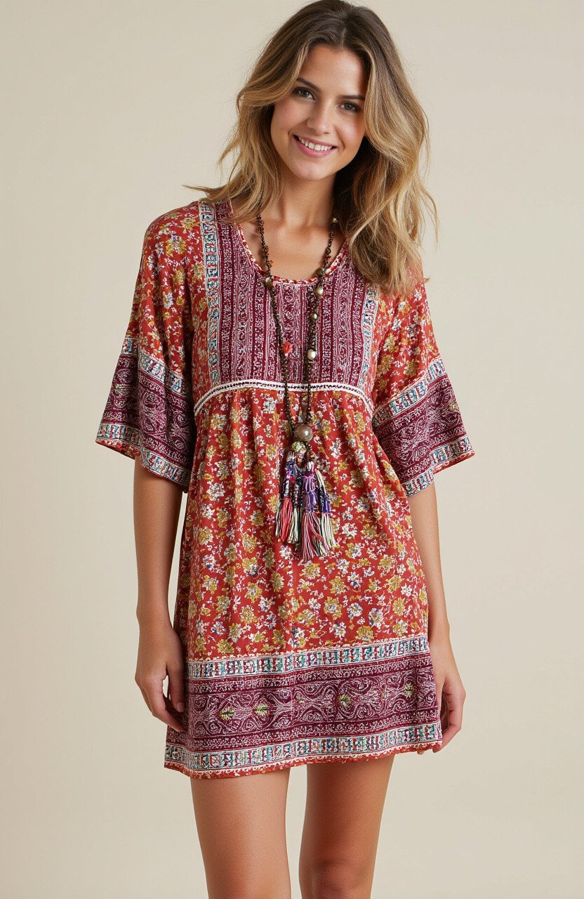 Float through the day with a bohemian batik dress. This style embraces flowy fabrics and earthy tones. It’s perfect for those who love a laid-back, free-spirited vibe.