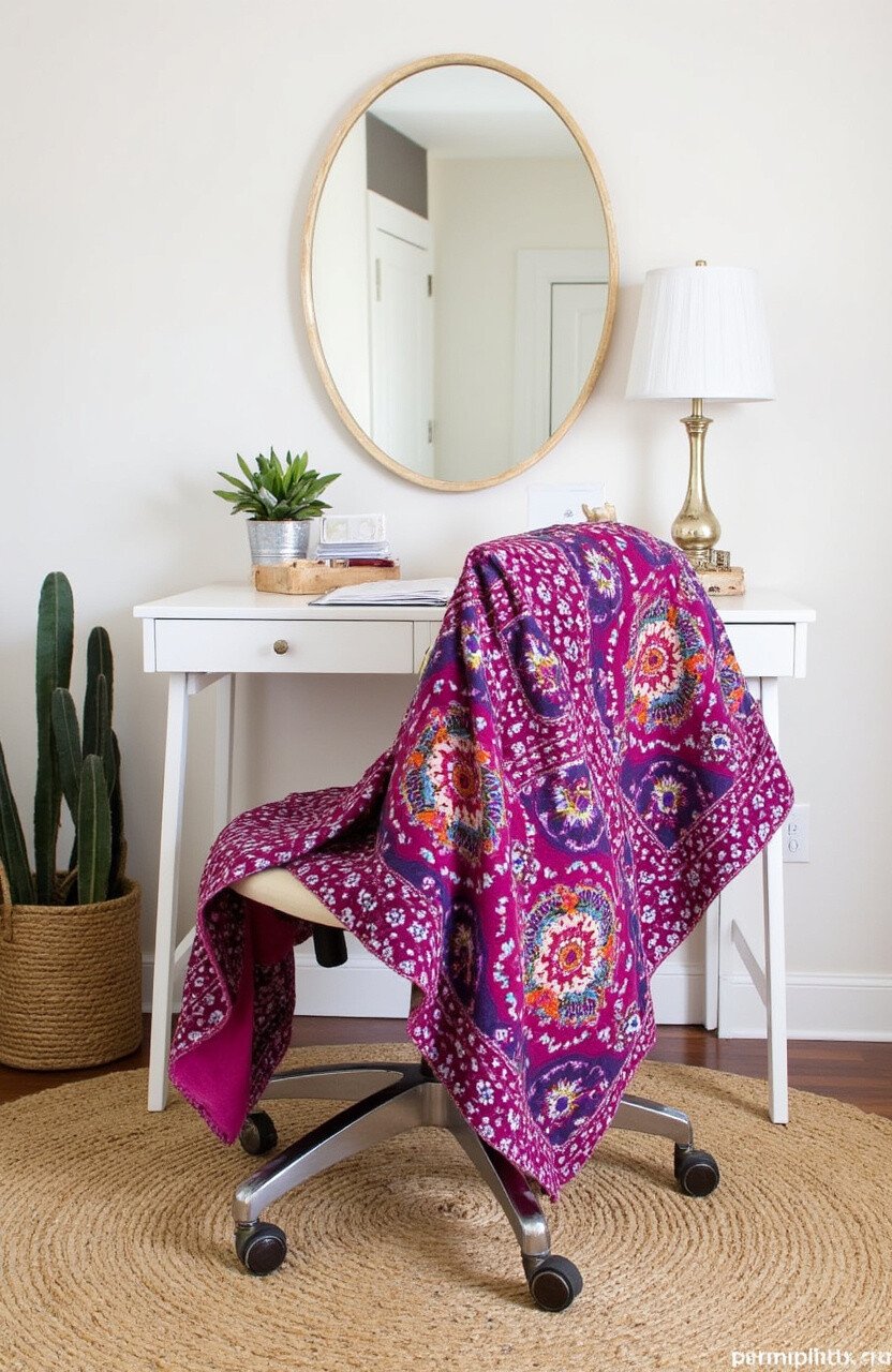 Cover your office chair with a batik throw for a stylish workspace. It’s a simple way to add color and comfort to your office. Choose a pattern that inspires creativity.