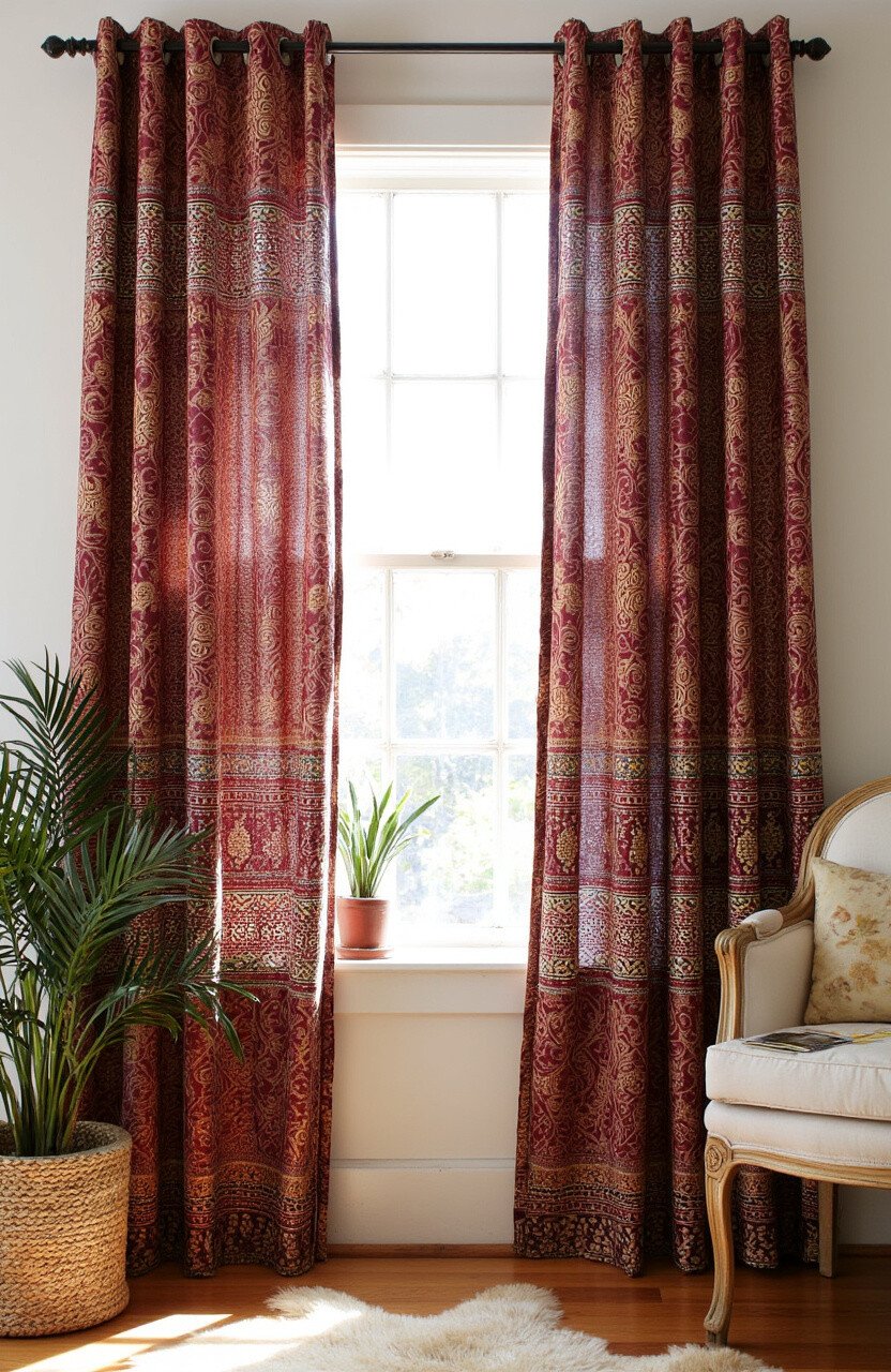 Bring the boho vibe to your home with batik curtains in earthy tones and eclectic patterns. They can transform any room into a cozy, welcoming retreat. Think deep reds, warm browns, and rich greens.