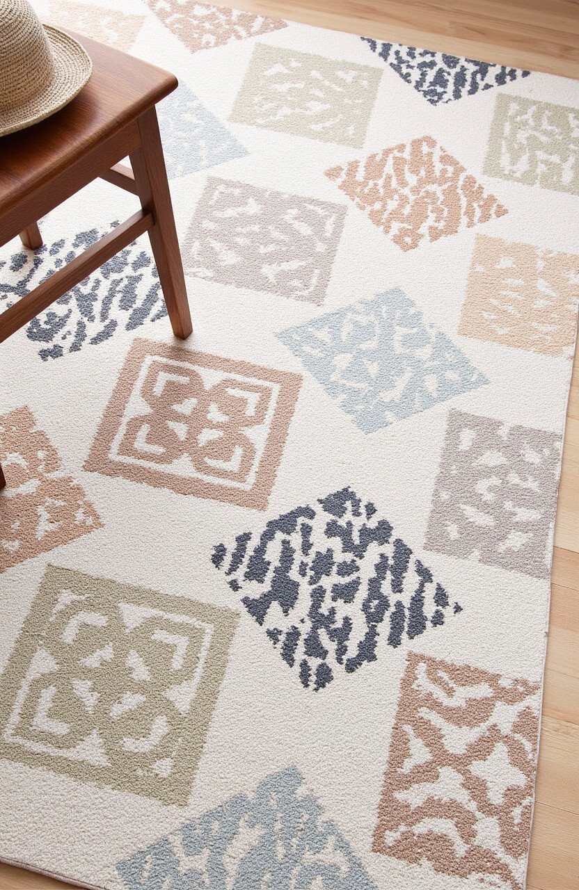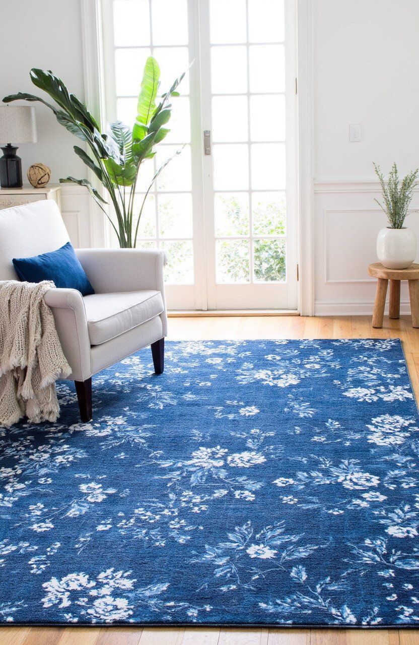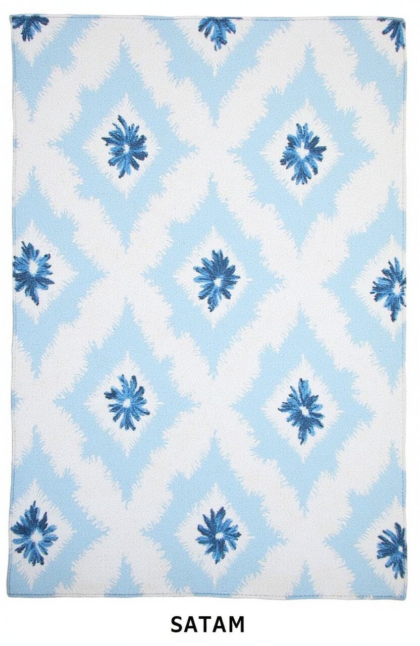 For a beachy, coastal vibe, blue and white batik rugs evoke the feeling of sand and sea. These rugs are perfect for creating a relaxed, vacation-like atmosphere in your home.