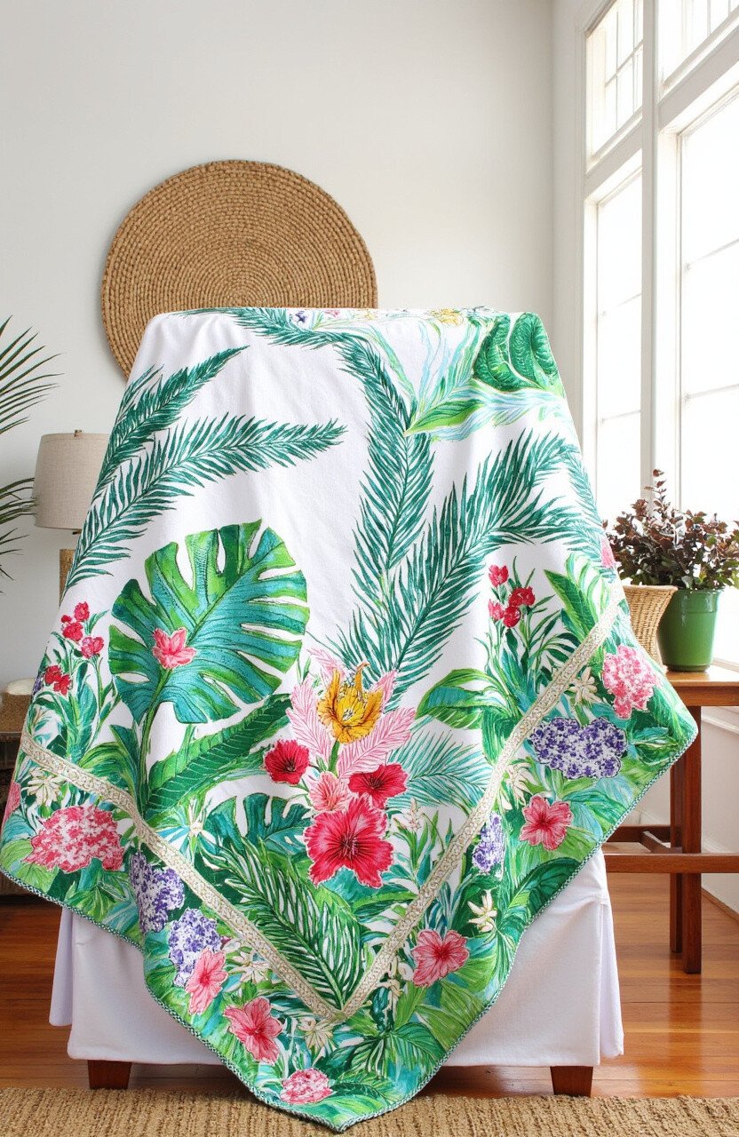 Imagine a throw that brings the lush greens and vibrant florals of a tropical island into your living room. The Tropical Paradise Throw features intricate batik patterns of palm leaves and exotic blooms, embroidered with vivid threads.