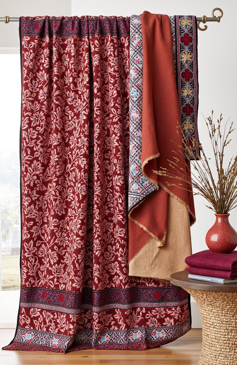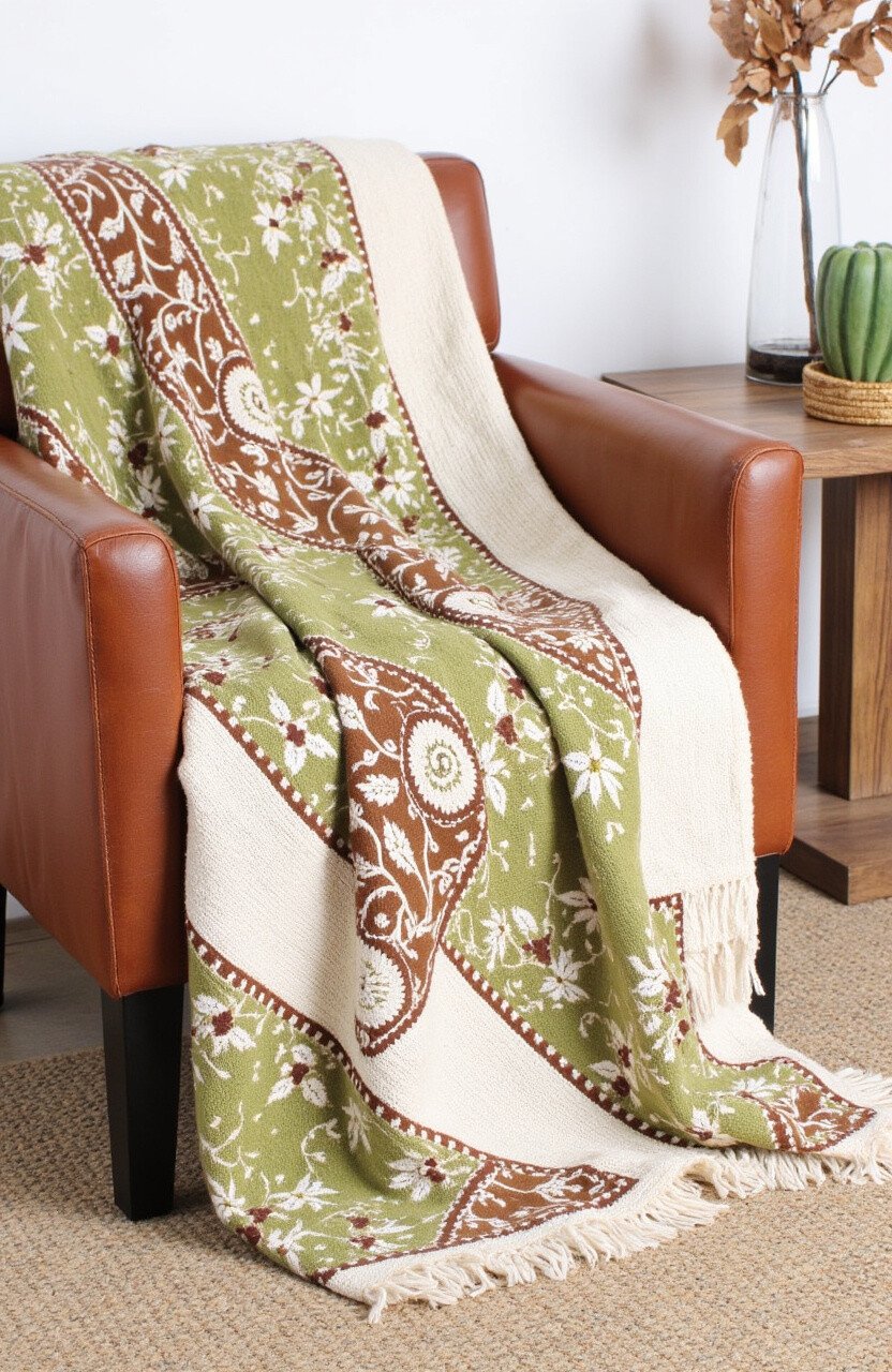 For a more grounded and serene atmosphere, the Earthy Elegance Throw is the go-to choice. It combines warm browns, soft creams, and deep greens in a harmonious batik pattern. The hand-embroidered details add texture and depth, making it a cozy addition to any space.