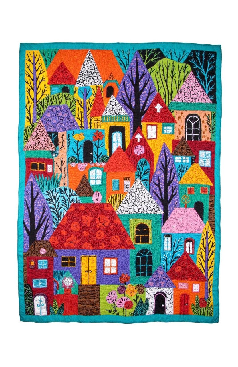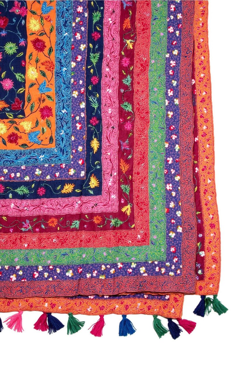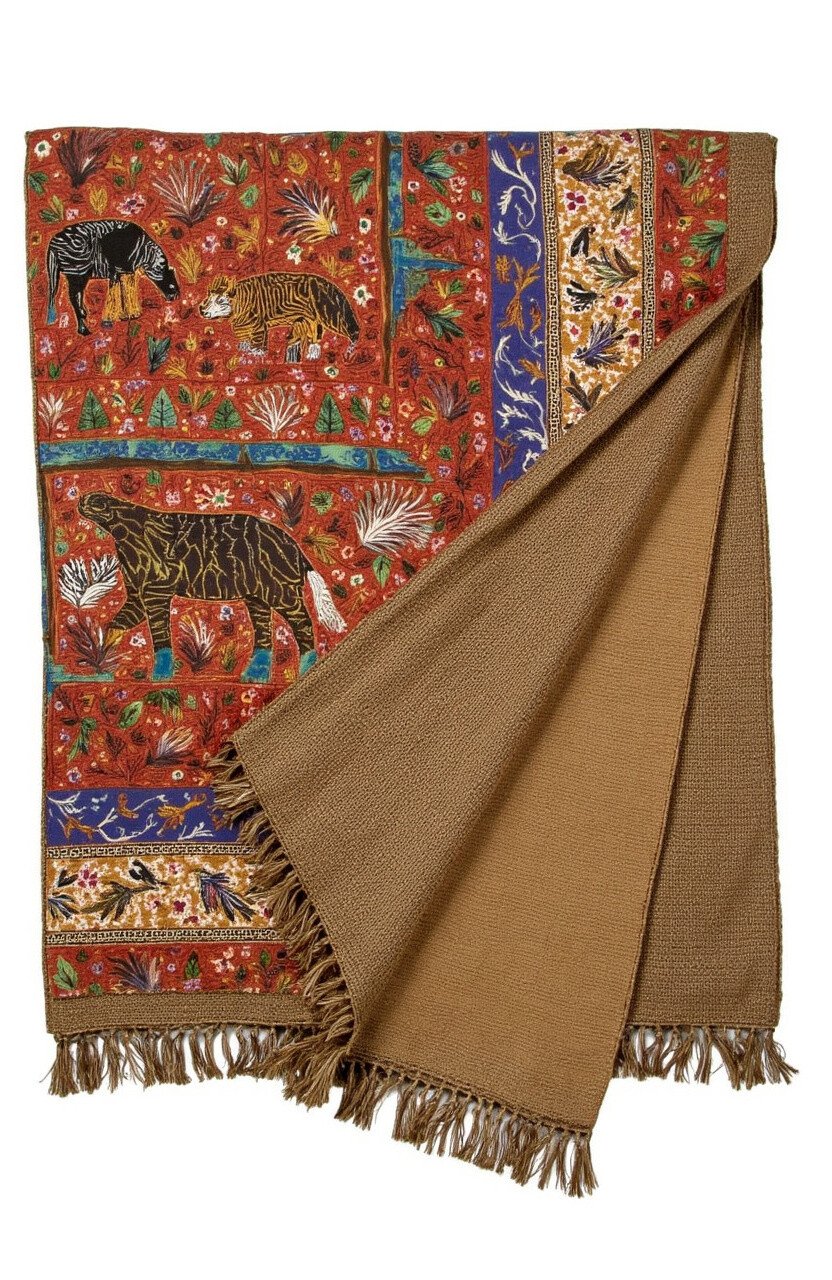 The Vibrant Village Throw is a celebration of community and culture, featuring colorful batik designs inspired by village life. The rich embroidery adds depth and character to this lively piece.