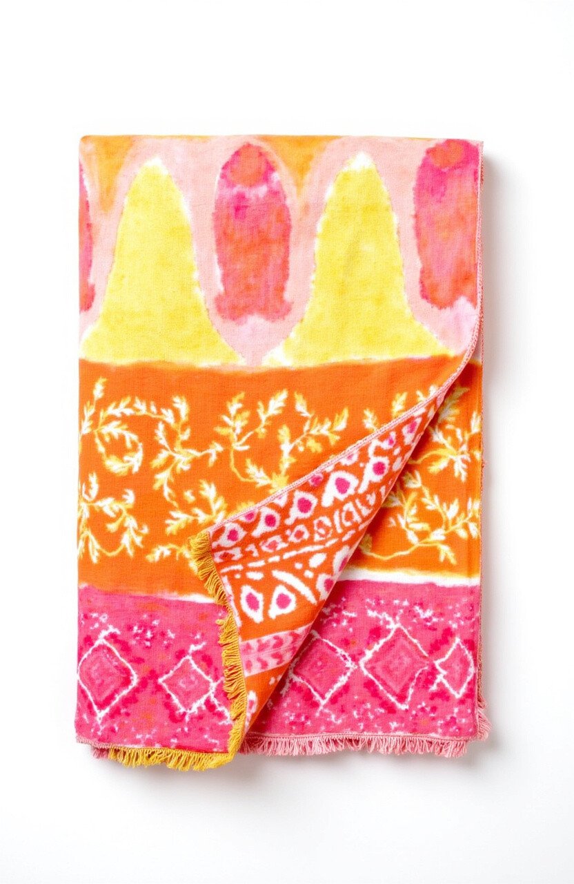 Awaken your senses with the vibrant hues of the Sunrise Splendor Throw. This piece captures the beauty of a new dawn with its blend of orange, pink, and yellow batik patterns.