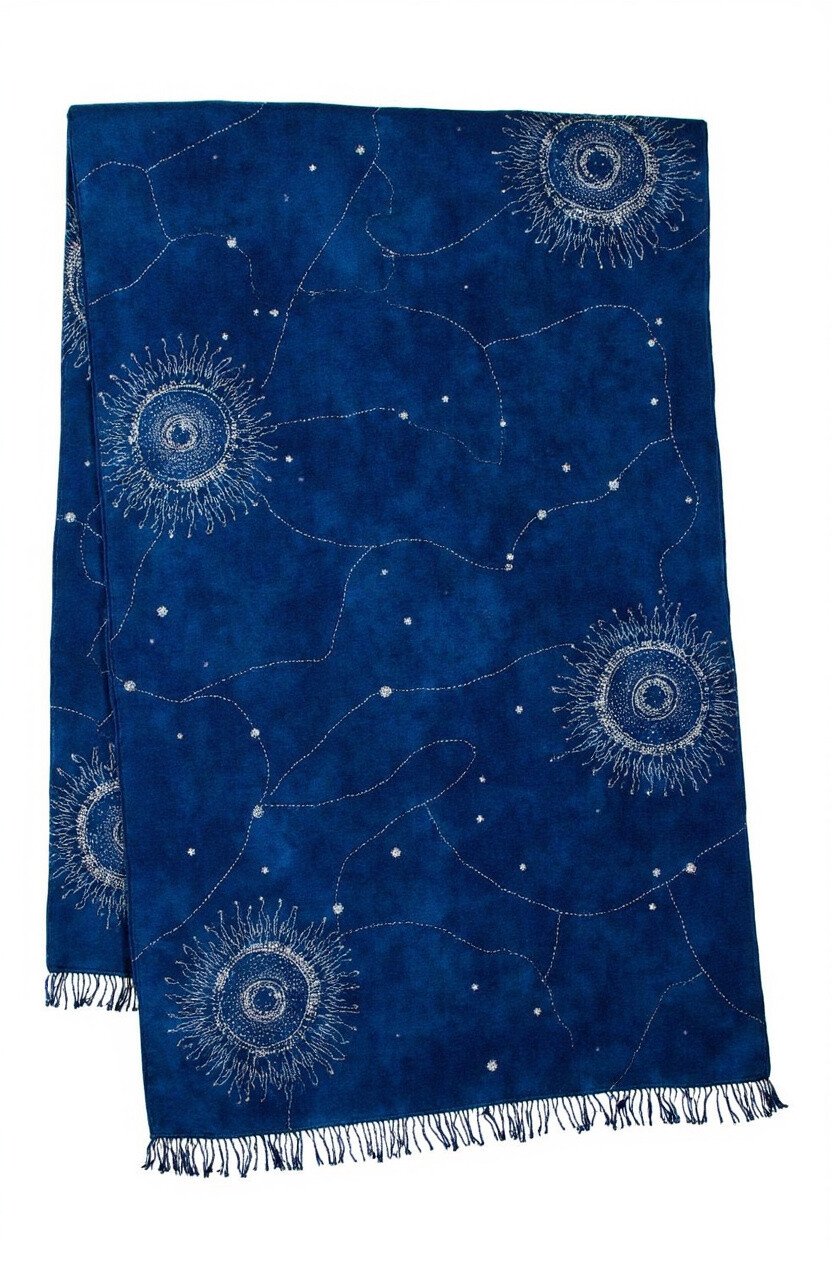 The Mystical Night Throw captures the enchantment of a starry night with its deep blues and silver-threaded embroidery. The intricate batik designs twinkle like constellations, adding a touch of magic to any room.