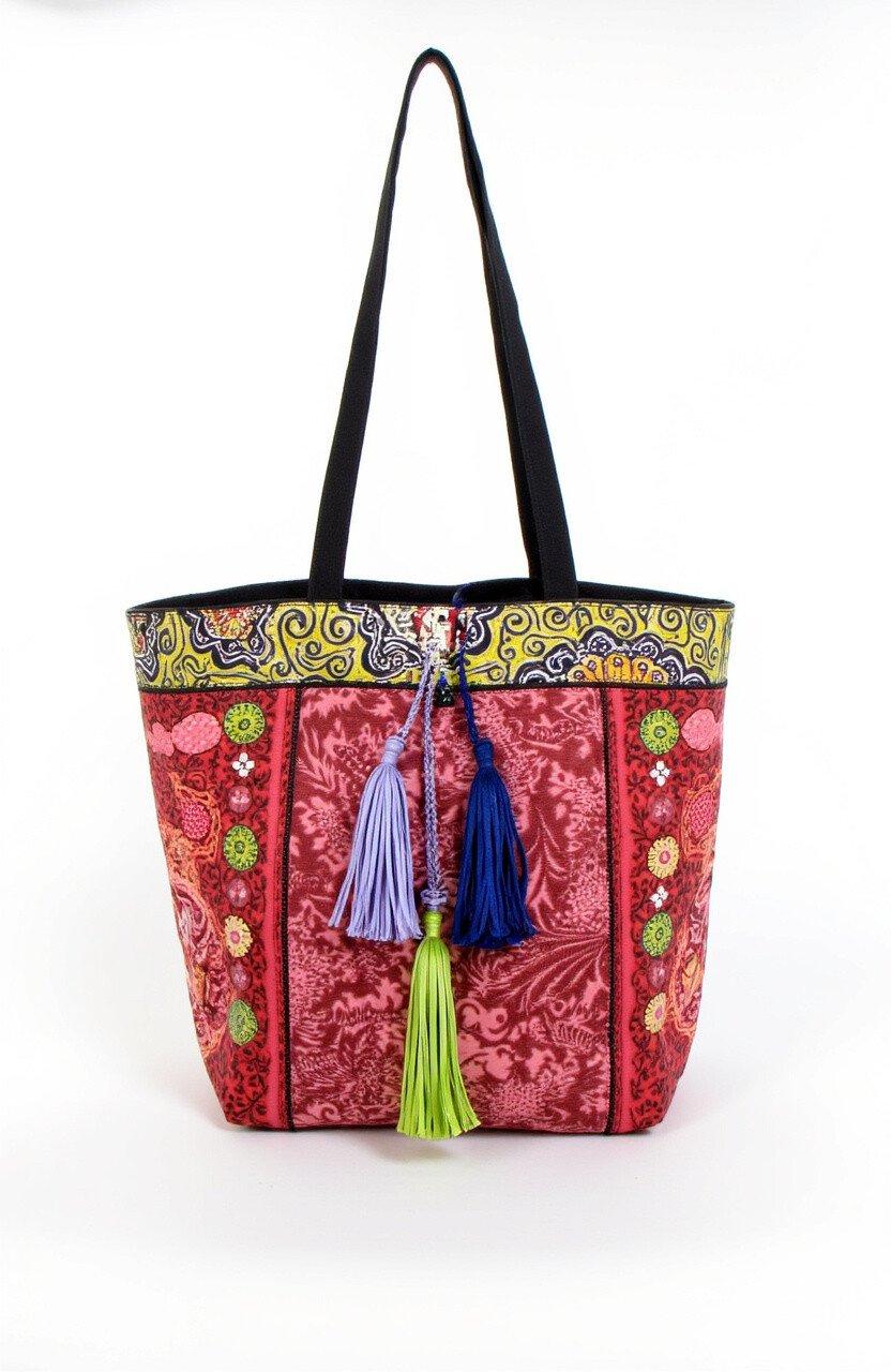 This tote bag is all about fun and flair. The batik patterns and playful tassels make it a standout piece.