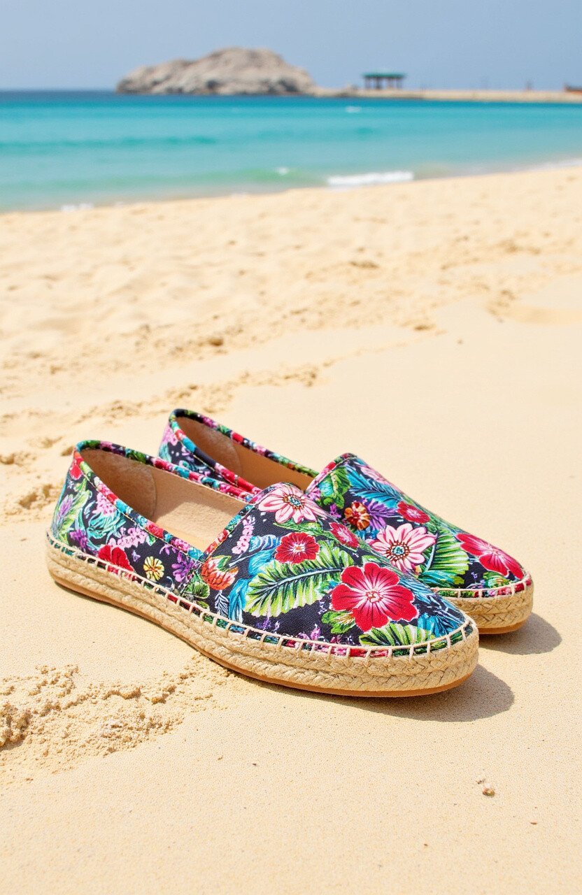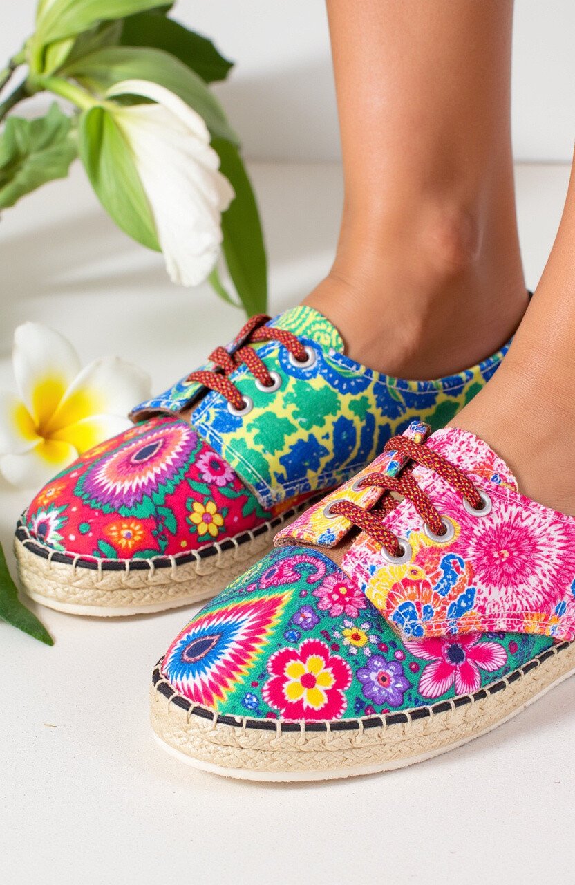 Picture yourself walking on a sandy beach, the sun shining down, and the sea breeze in your hair. Tropical batik patterns bring that vibe to your feet! With palm leaves and bright floral designs, these espadrilles can brighten any day.