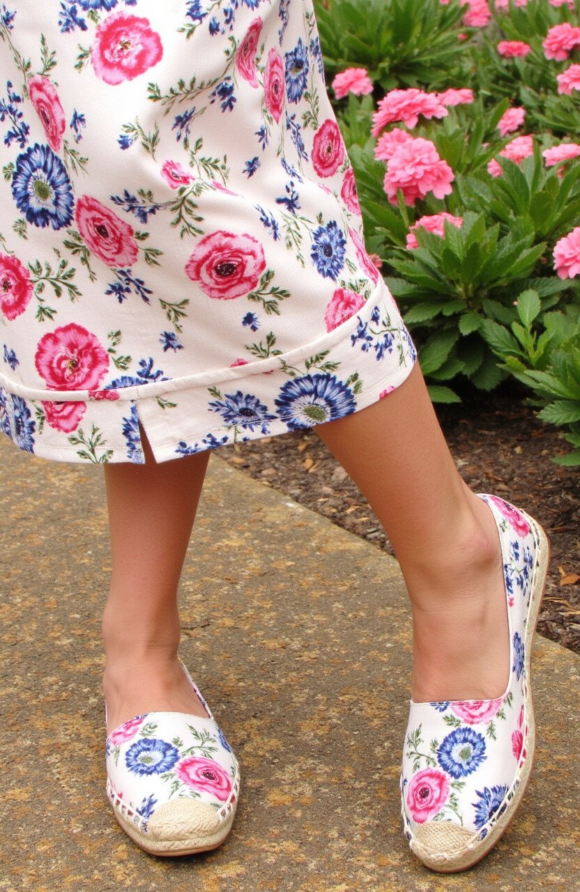 Imagine stepping into a garden filled with blooms from the past. Vintage floral batik brings that charm to life. With delicate roses and daisies, these espadrilles are like a walk through time.