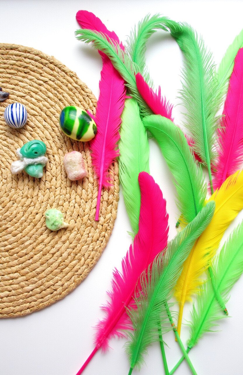 Tropical paradise feathers are bright and cheerful. They feature bold greens, pinks, and yellows, reminiscent of a tropical getaway.
