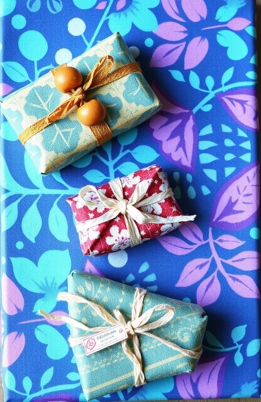 Wrap a scarf gift in more batik fabric for a double surprise! The fabric enhances the gift’s elegance and style.
