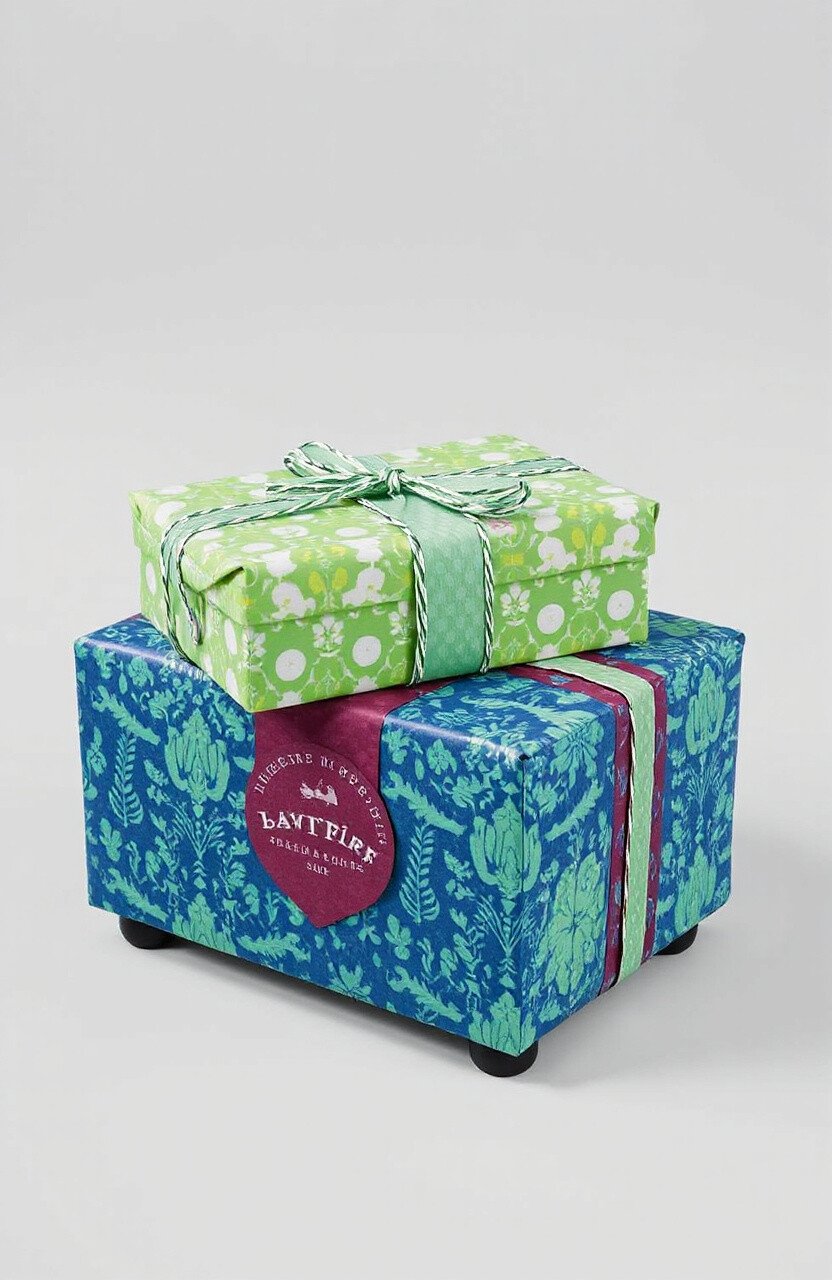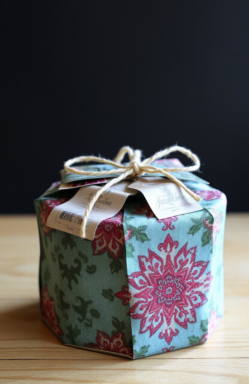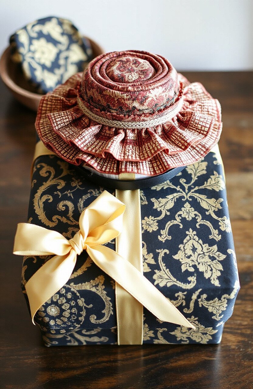Wrap hat boxes in batik for an elegant presentation. The fabric adds a touch of sophistication to the gift.