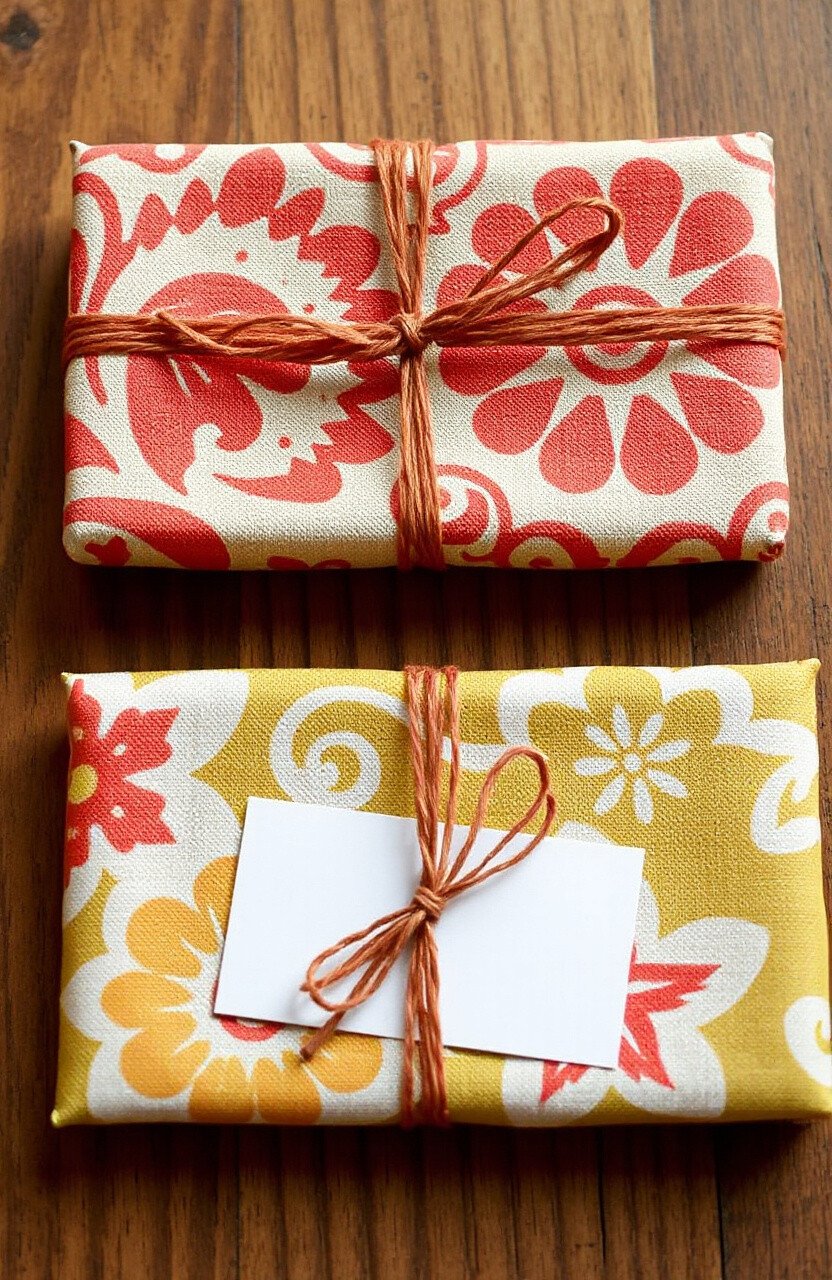 Wrap kitchen gifts in batik fabric to create a set of creative towels. The fabric adds a decorative element to practical gifts.