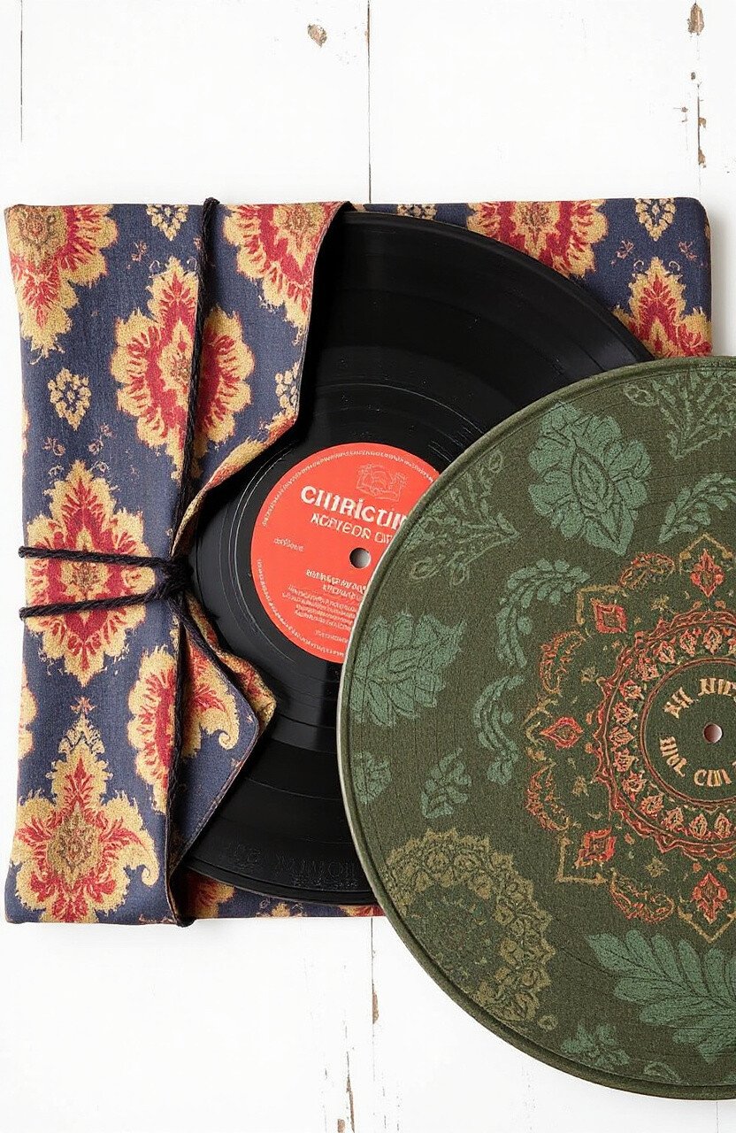 Wrap vintage records in batik for a retro feel. The fabric’s patterns add a touch of nostalgia.