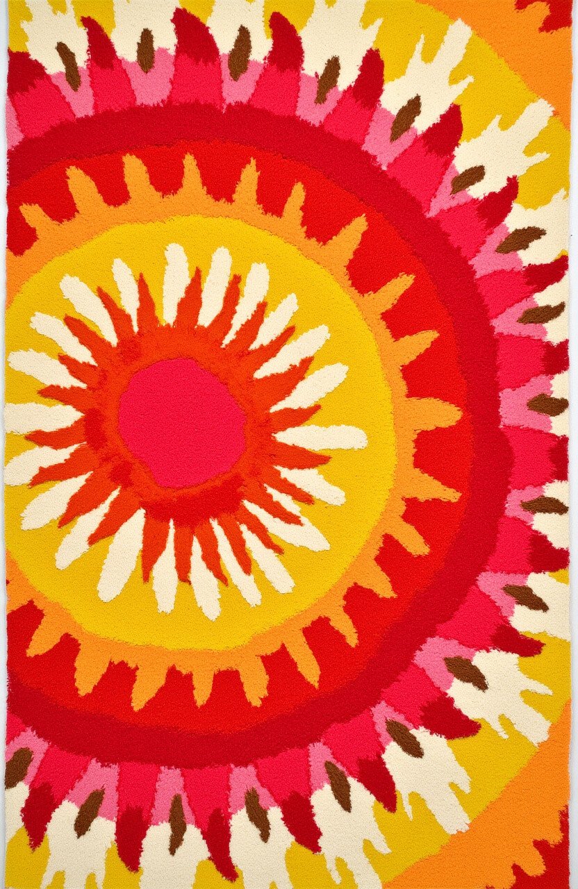 Brighten up any room with this vibrant sunburst design. The warm colors of red, orange, and yellow radiate joy and happiness.