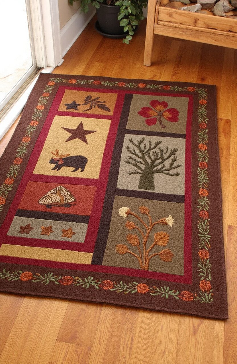 Imagine the warmth of a wooden cabin with this rustic mat. Soft browns and reds make it feel like a cozy retreat.