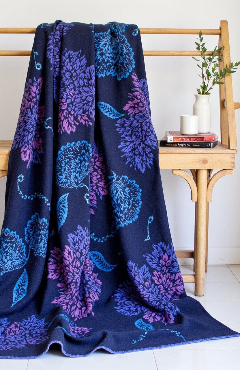 This throw is like a garden that wakes up under the moonlight. Deep blues and purples are adorned with floral motifs that seem to blossom in the night. It’s perfect for adding a mysterious and elegant touch to your couch or bed.