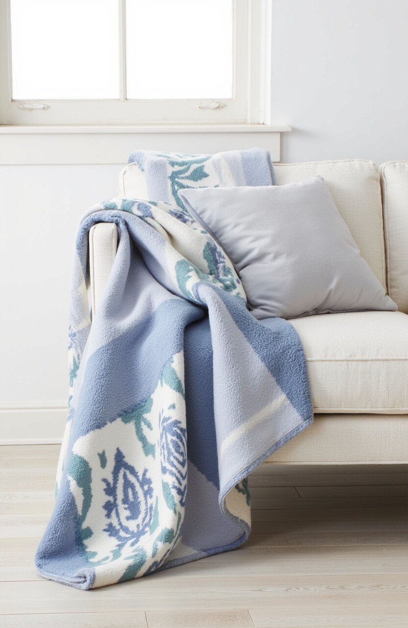 Soft grays and blues create a calming, cozy atmosphere. This throw is perfect for winding down at the end of the day.