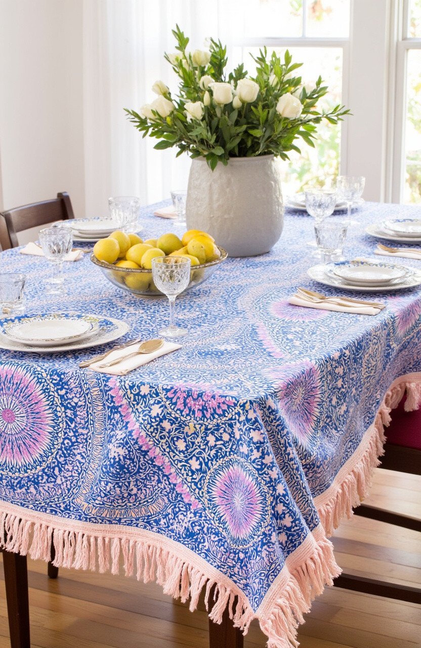Transform your dining experience with a batik fringe tablecloth. Lay it over your dining table for a unique and colorful setting.