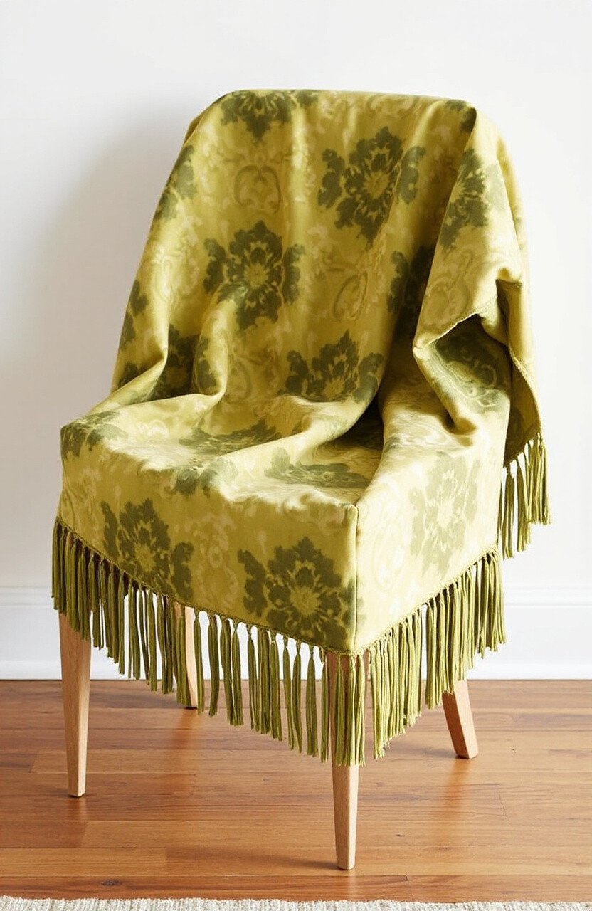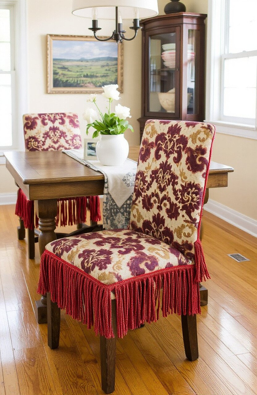 Revitalize old chairs by draping batik fringe covers over them. This simple trick adds comfort and a fresh look to your seating.