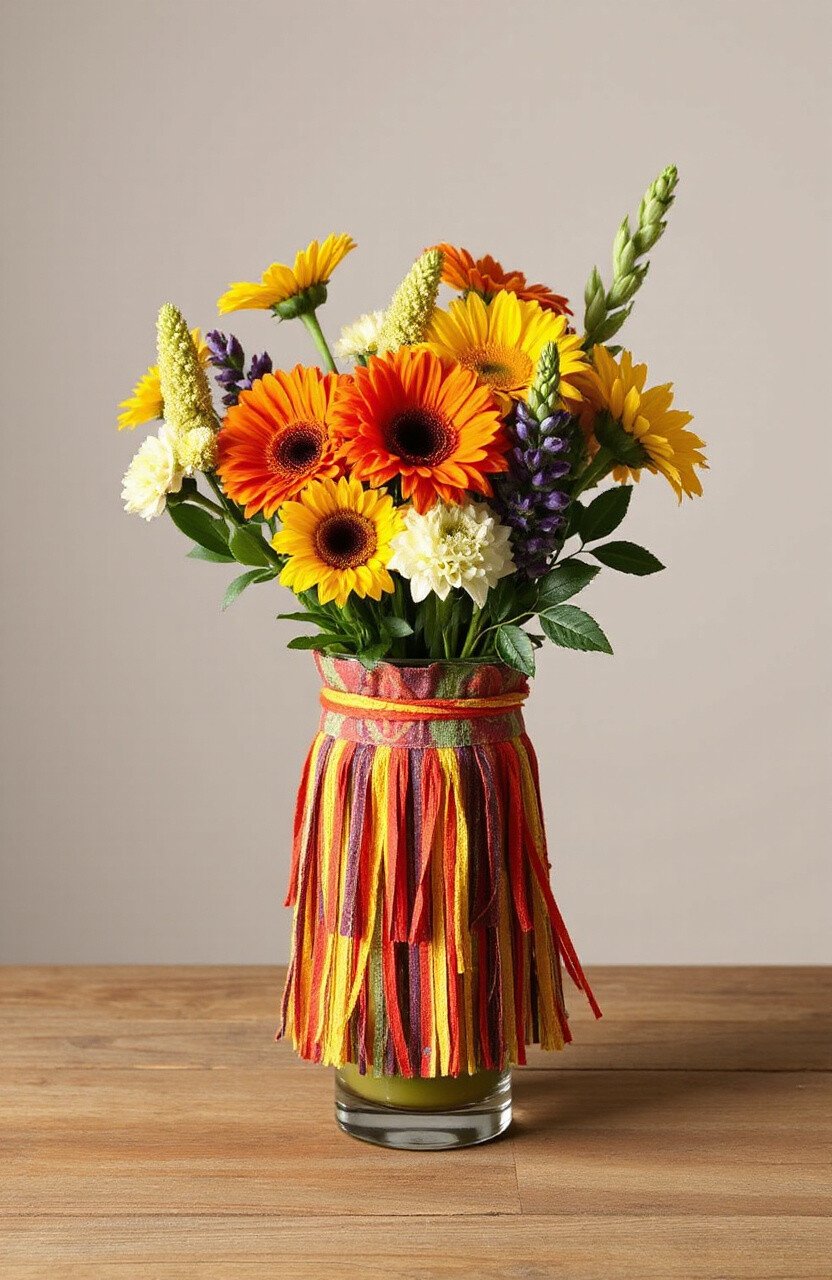 Wrap a batik fringe cover around a vase for a vibrant display. Its colors and patterns make floral arrangements more striking.