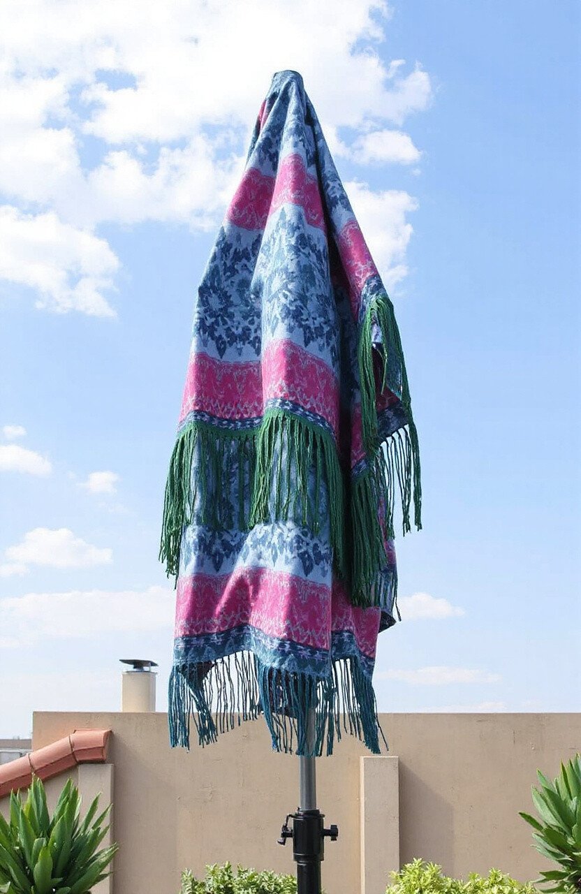 Protect your outdoor umbrella with a batik fringe cover. Its colorful design makes your patio more cheerful.