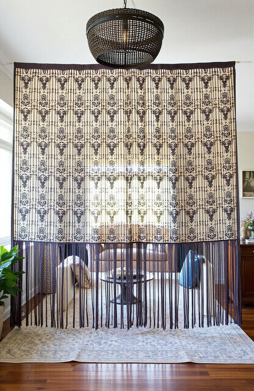 Create distinct spaces in a room with a batik fringe cover as a divider. Hang it from the ceiling for an artistic and functional partition.