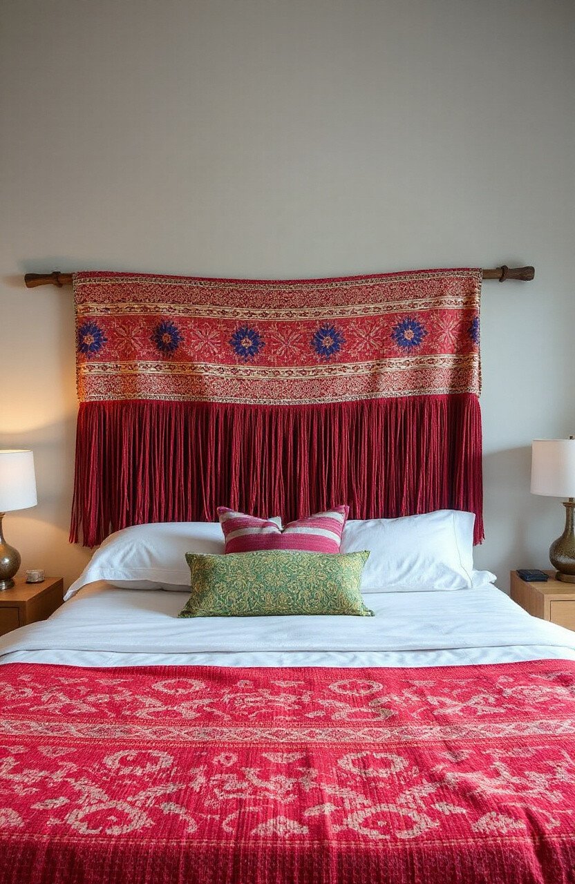 A batik fringe cover can serve as a creative headboard for your bed. Hang it behind the bed to add color and interest to your sleep space.