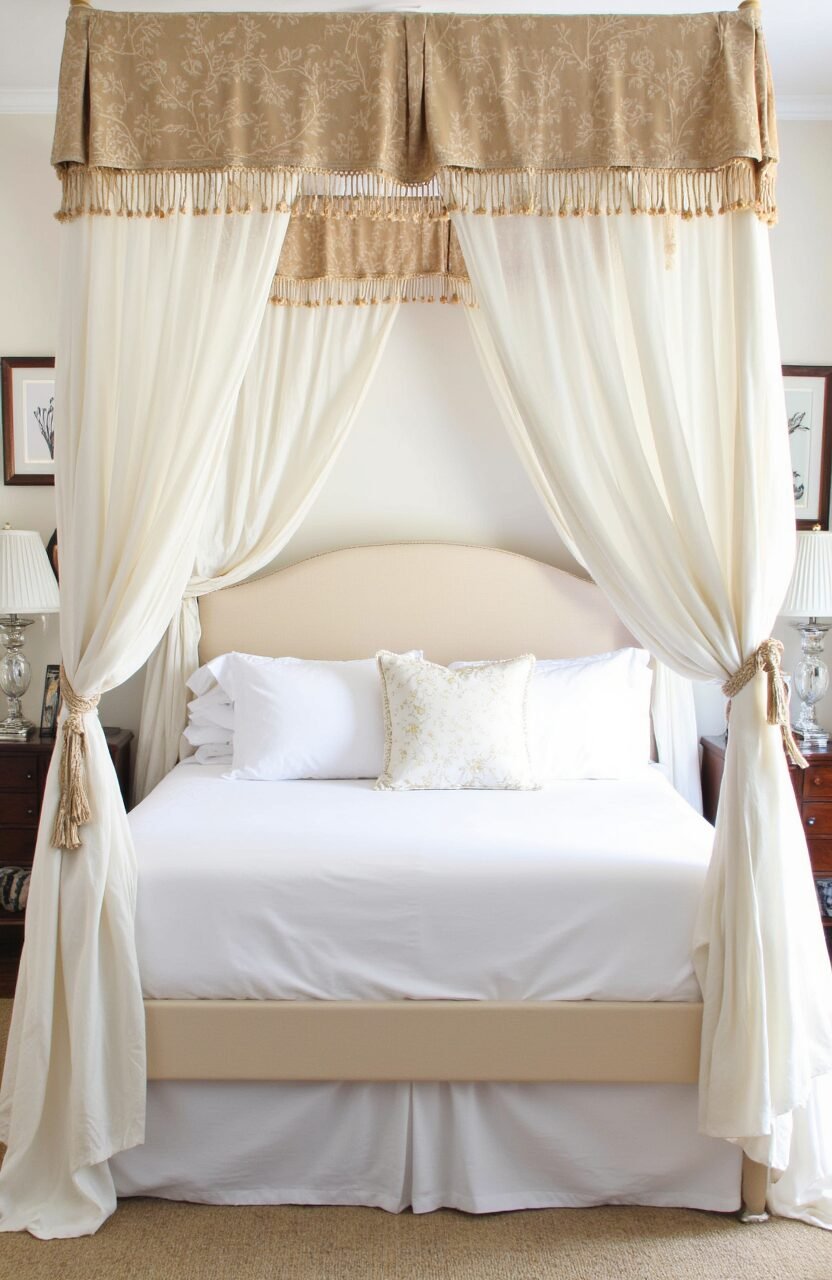 Add a touch of romance to your bedroom with a canopy bed draped in batik fringe curtains. Their soft, flowing design creates an intimate atmosphere. Choose neutral colors for a calming effect.