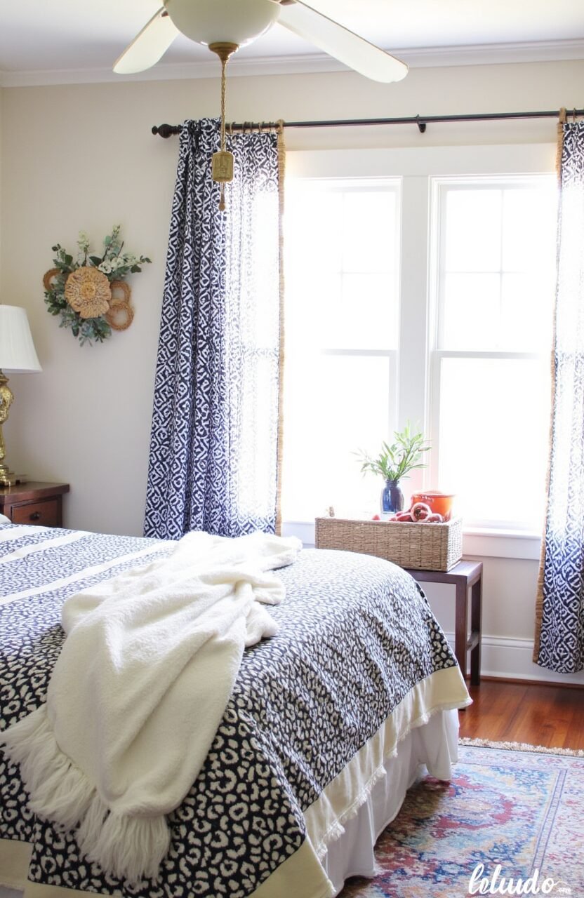 Decorate your guest room with travel-inspired batik fringe curtains. Their exotic patterns make guests feel like they’re on an adventure. Add travel-themed decor for a cohesive look.