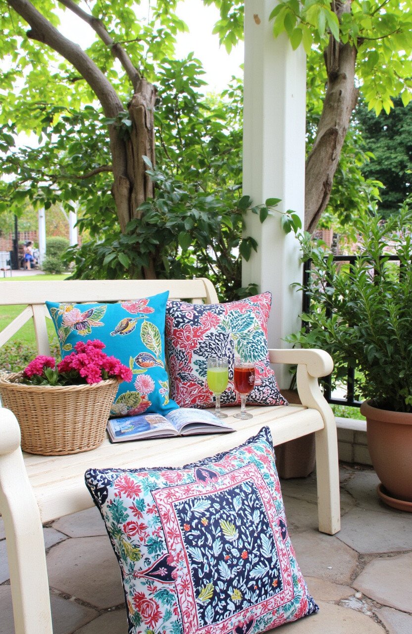 For a cozy, country-inspired garden, choose batik cushions in soft pastel colors and floral patterns. These designs work beautifully with rustic wooden furniture and natural accents like burlap or twine.