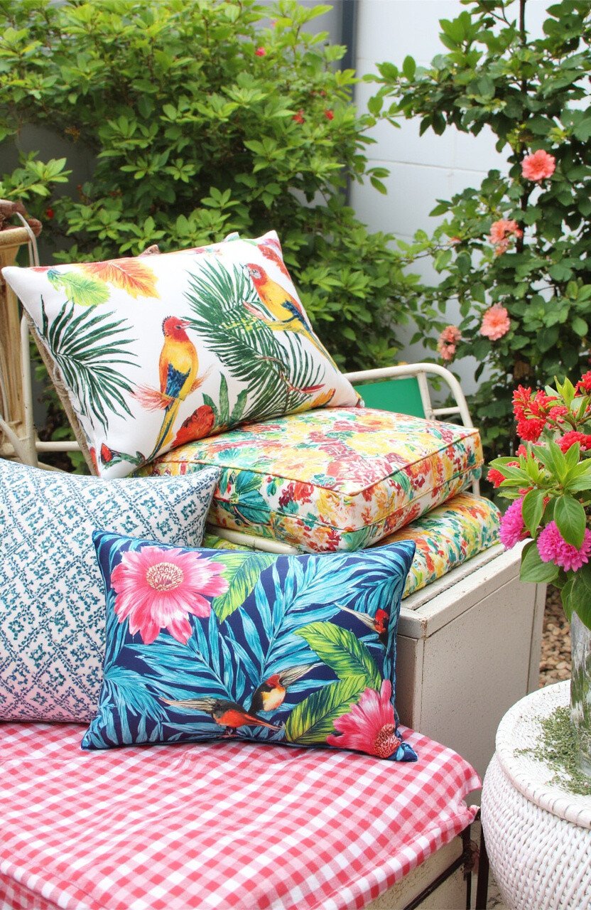 Create a little slice of paradise in your garden with batik cushions that feature tropical prints. Think palm leaves, vibrant flowers, and exotic birds. These designs bring a burst of color and a sense of adventure to your outdoor space.