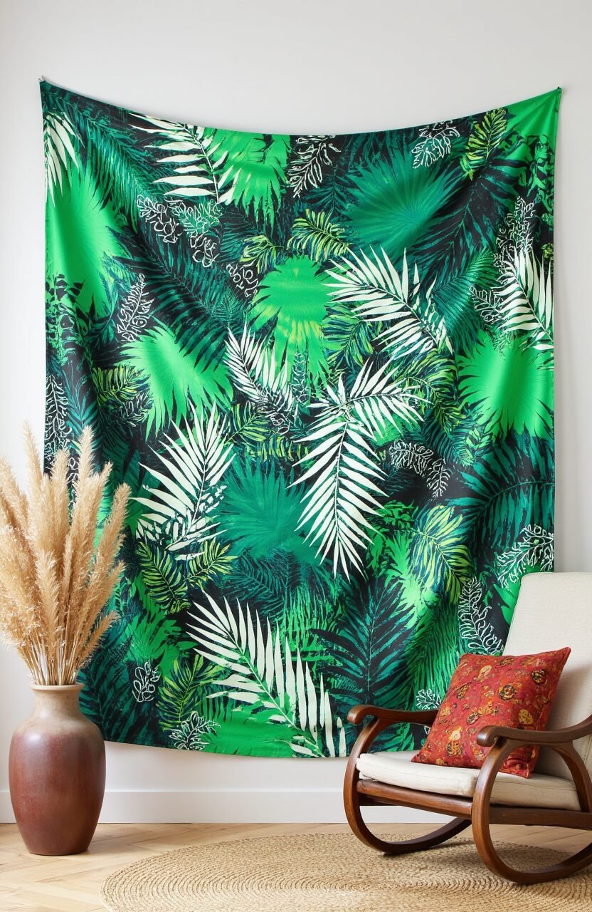 The Abstract Jungle Rhythm tapestry bursts with lively greens and vibrant patterns, bringing the wild beauty of the jungle indoors. It’s perfect for adding a splash of color and life to your home.