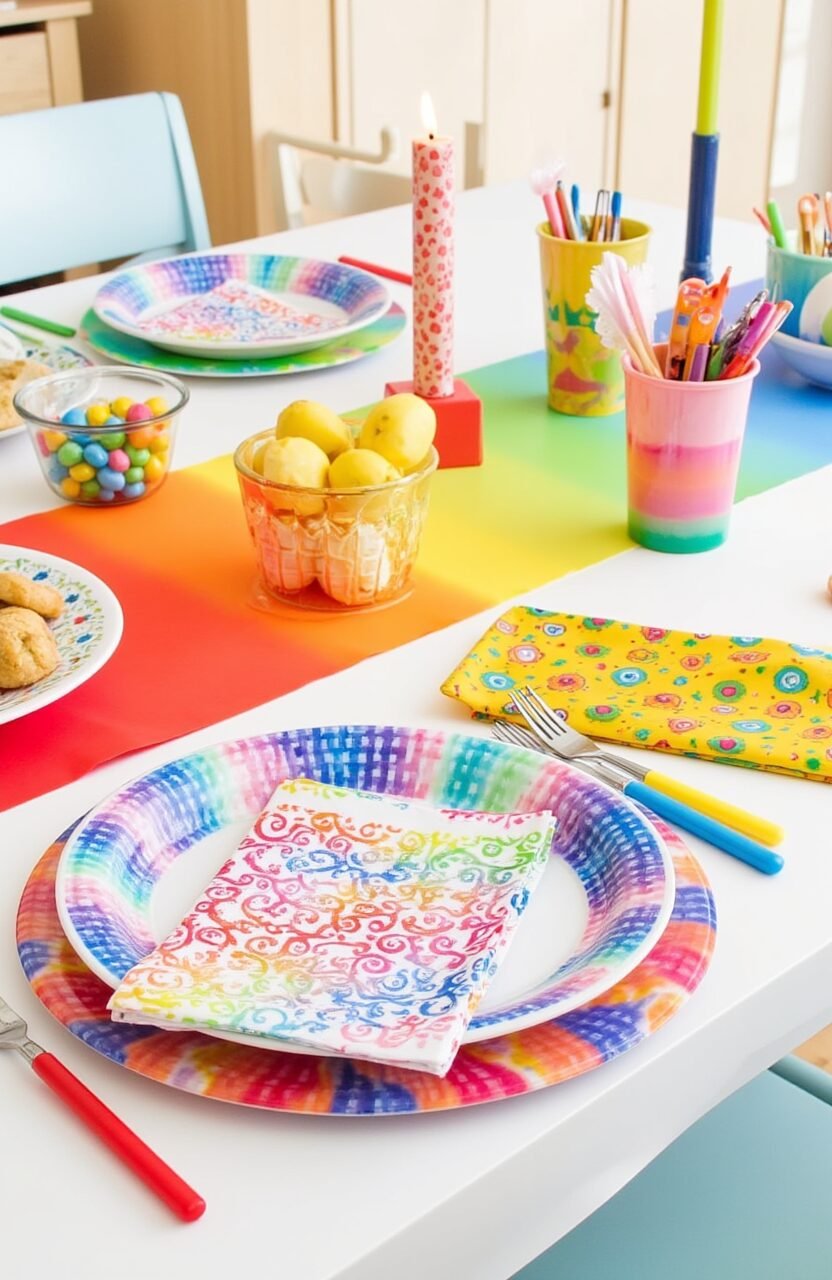 Celebrate all things colorful with a rainbow-themed table setting. Batik gingham napkins offer a burst of color and joy.