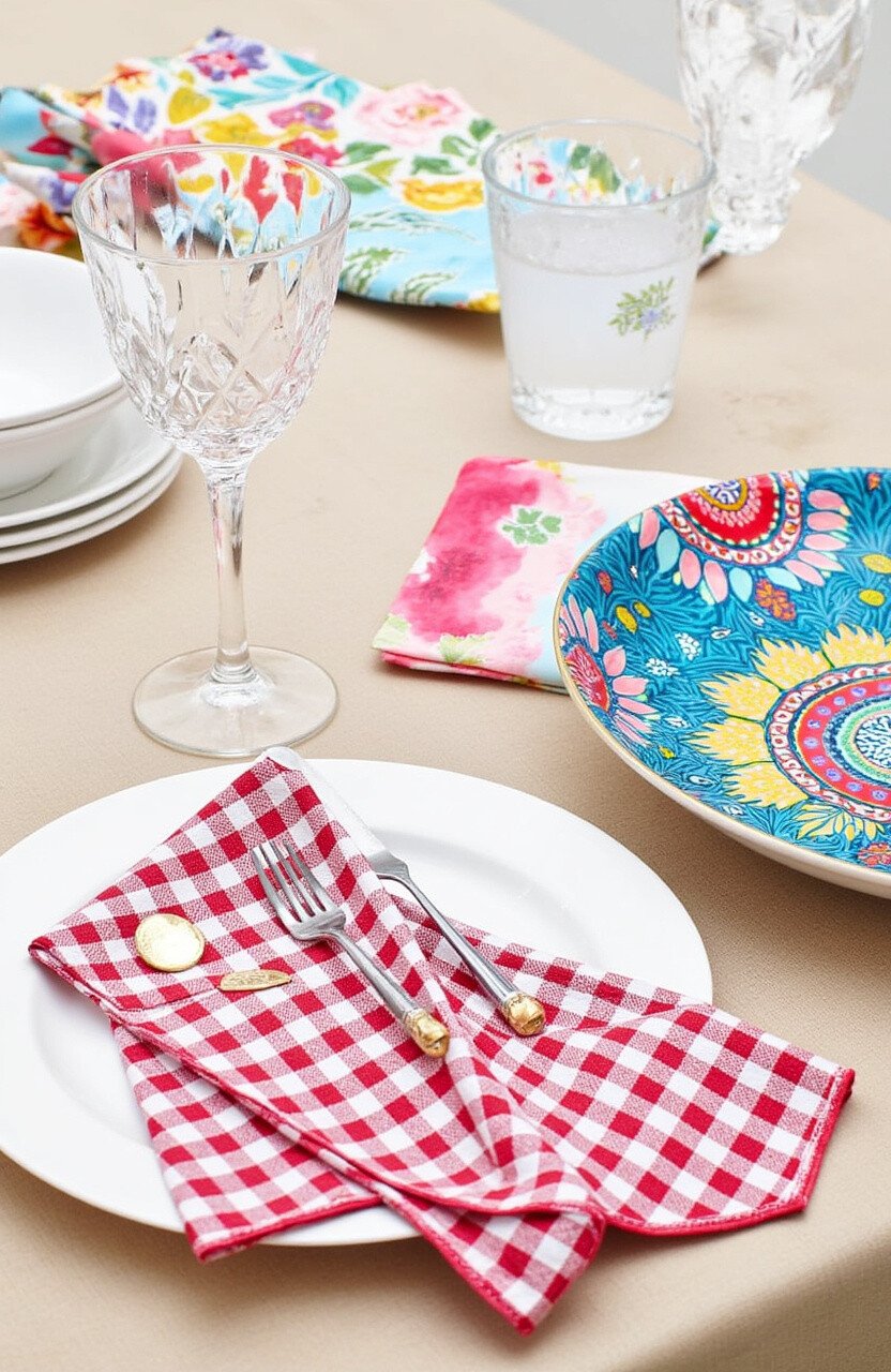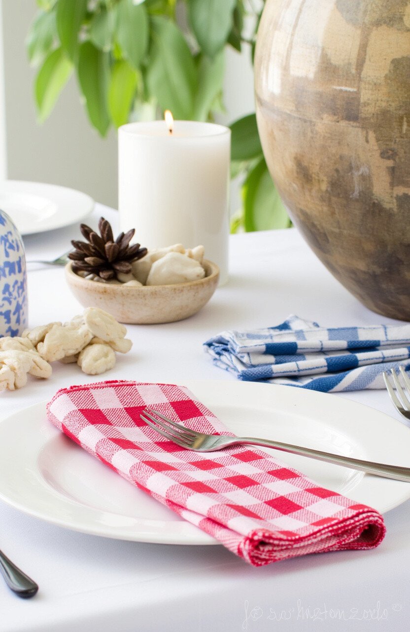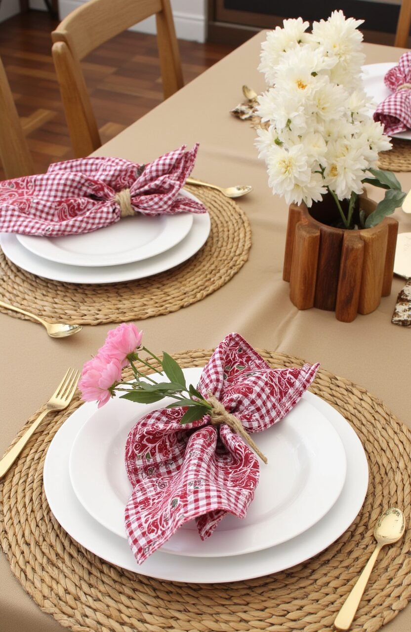 Imagine the charm of a countryside picnic right in your dining room. Pairing batik gingham napkins with wooden tableware creates a rustic vibe that’s warm and inviting.