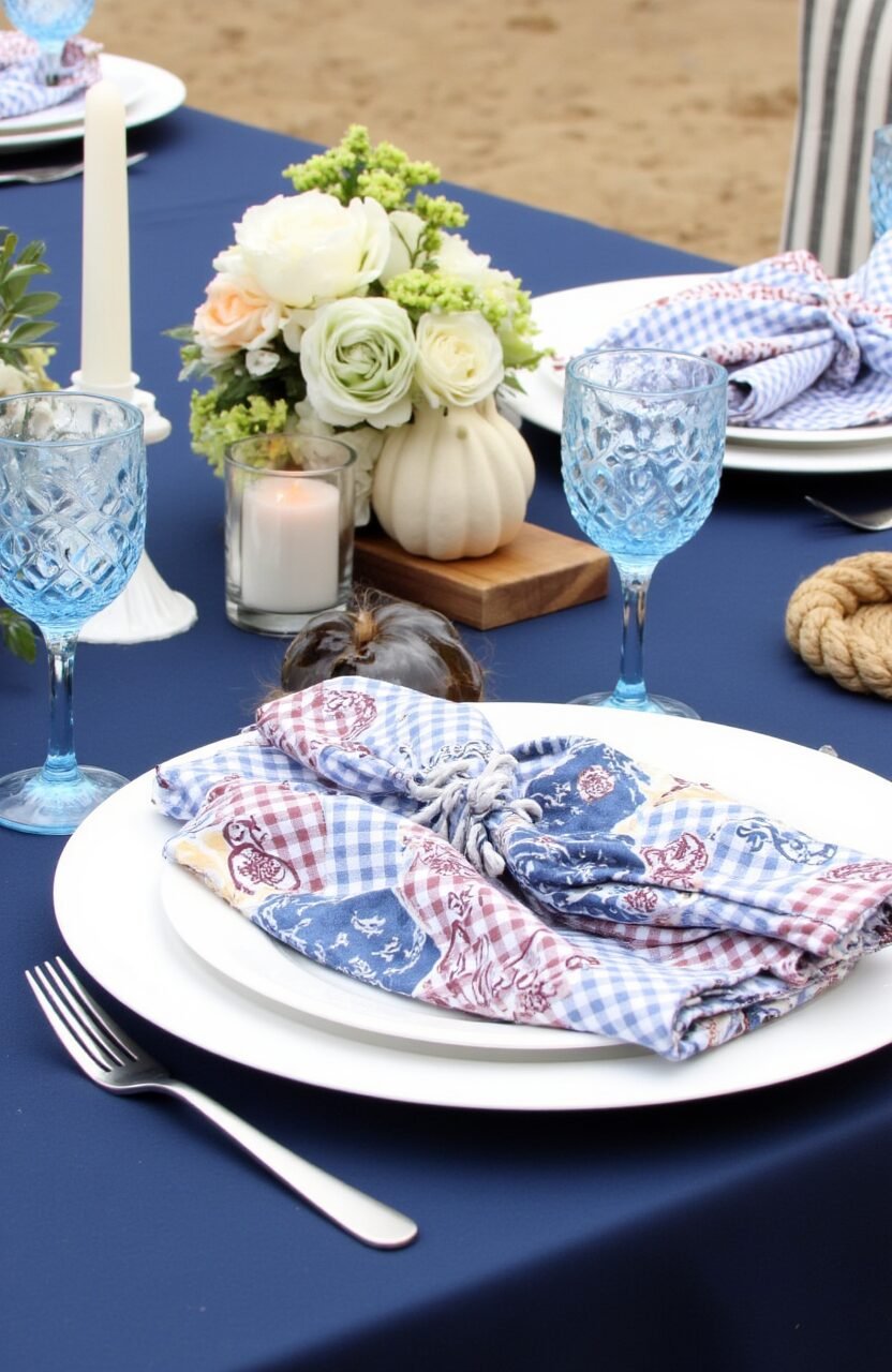 Sail away with nautical-themed table settings. The crisp lines and bold colors of batik gingham napkins echo the essence of the sea.